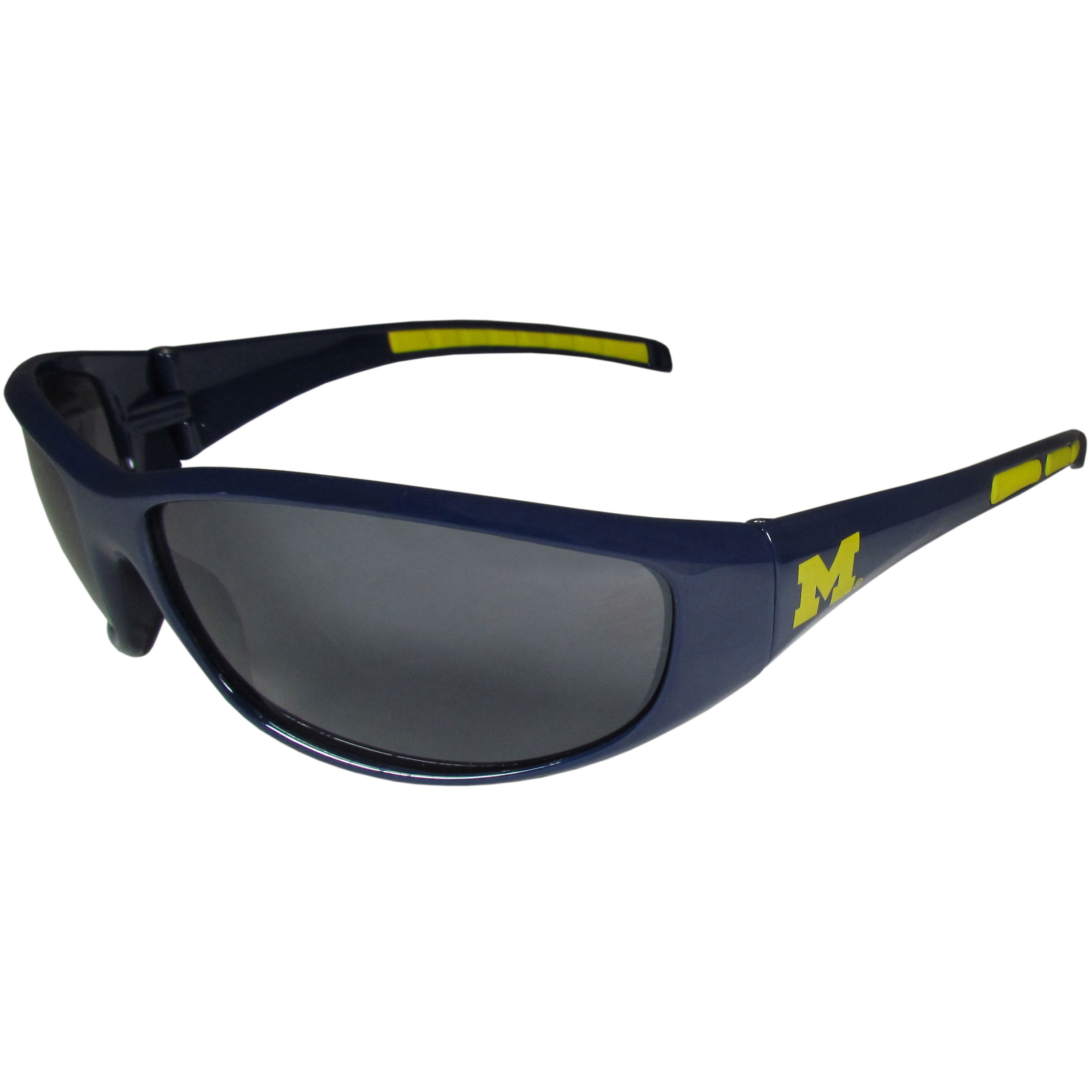 Whether you're in the stadium cheering your Michigan Wolverines to victory, driving or just lounging by the pool these stylish shades are the perfect accessory with a 100% UVA/UVB rating for maximum UV protection. The light-weight frames are built to last with flex hinges for comfort and durability. The colorful rubber grips on the arms of these fashionable sunglasses make them perfect for someone with an active lifestyle. Whether you are hiking, fishing, boating, running on the beach, golfing or playing your favorite sport these designer frames will stay in place for all of your outdoor activities. Our wrap sunglasses are true quality eyewear at an affordable price. Their classic wrap style is accented with bright team colors and team logos on both arms so you can show off your die-hard team pride while protecting your eyes from those bright sun rays.