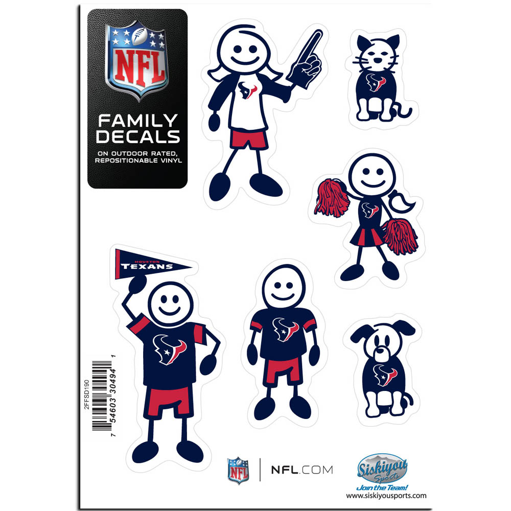 Show off your team pride with our Houston Texans family automotive decals. The set includes 6 individual family themed decals that each feature the team logo. The 5 x 7 inch decal set is made of outdoor rated, repositionable vinyl for durability and easy application.
