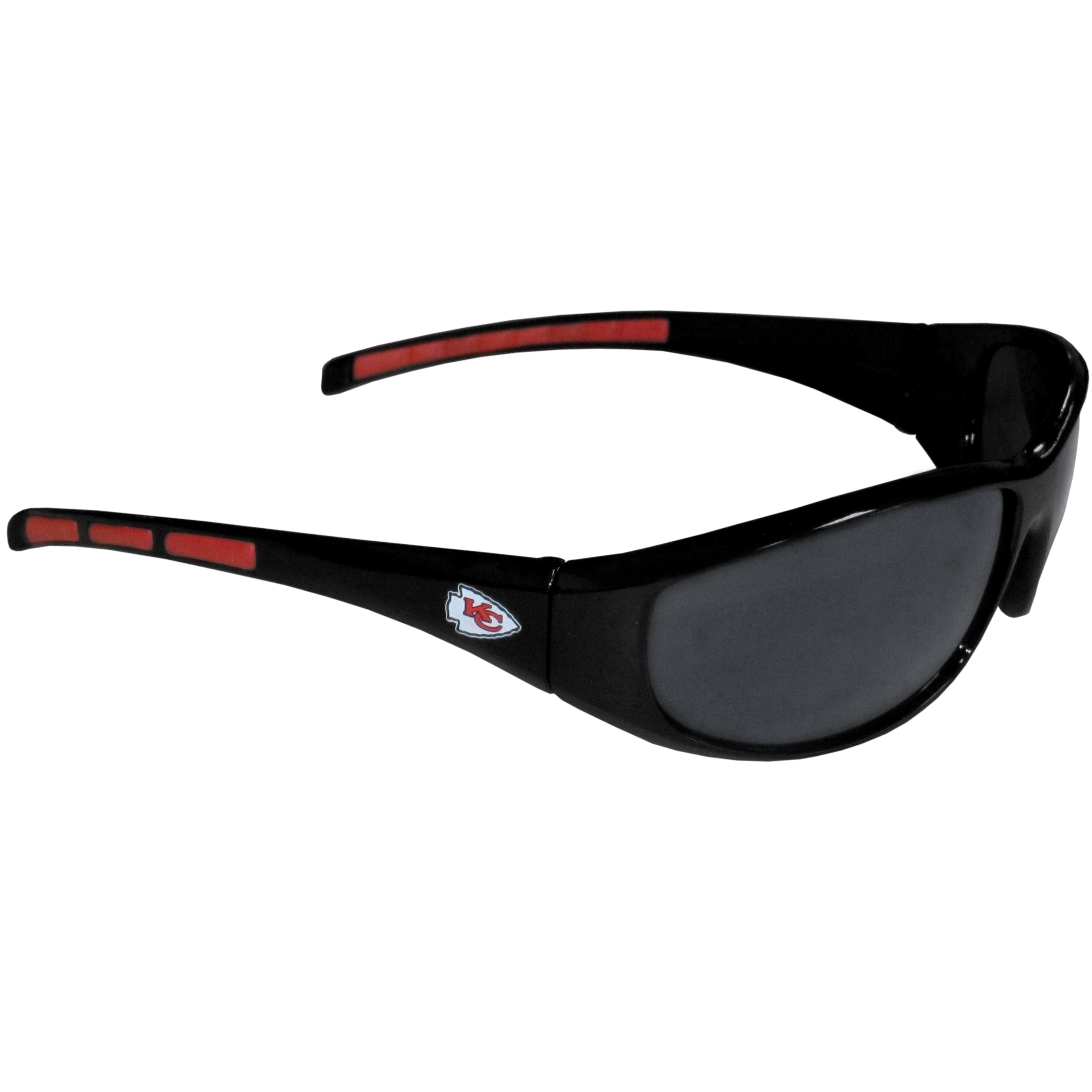Whether you're in the stadium cheering your Kansas City Chiefs to victory, driving or just lounging by the pool these stylish shades are the perfect accessory with a 100% UVA/UVB rating for maximum UV protection. The light-weight frames are built to last with flex hinges for comfort and durability. The colorful rubber grips on the arms of these fashionable sunglasses make them perfect for someone with an active lifestyle. Whether you are hiking, fishing, boating, running on the beach, golfing or playing your favorite sport these designer frames will stay in place for all of your outdoor activities. Our wrap sunglasses are true quality eyewear at an affordable price. Their classic wrap style is accented with bright team colors and team logos on both arms so you can show off your die-hard team pride while protecting your eyes from those bright sun rays.