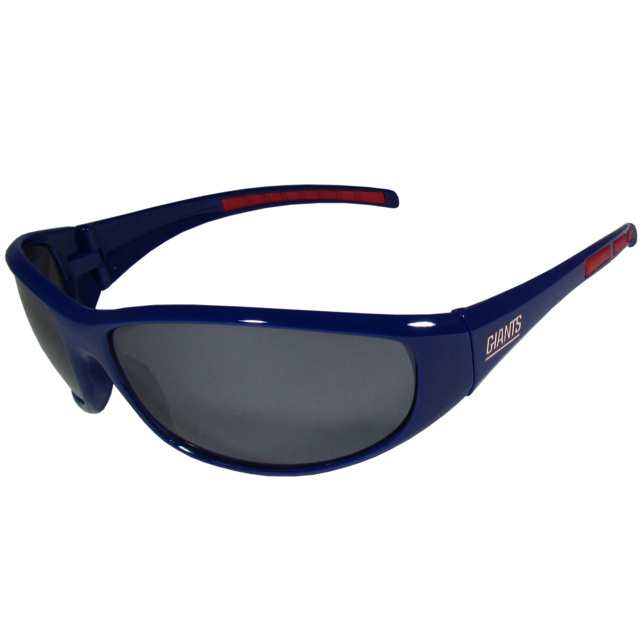 Whether you're in the stadium cheering your New York Giants to victory, driving or just lounging by the pool these stylish shades are the perfect accessory with a 100% UVA/UVB rating for maximum UV protection. The light-weight frames are built to last with flex hinges for comfort and durability. The colorful rubber grips on the arms of these fashionable sunglasses make them perfect for someone with an active lifestyle. Whether you are hiking, fishing, boating, running on the beach, golfing or playing your favorite sport these designer frames will stay in place for all of your outdoor activities. Our wrap sunglasses are true quality eyewear at an affordable price. Their classic wrap style is accented with bright team colors and team logos on both arms so you can show off your die-hard team pride while protecting your eyes from those bright sun rays.