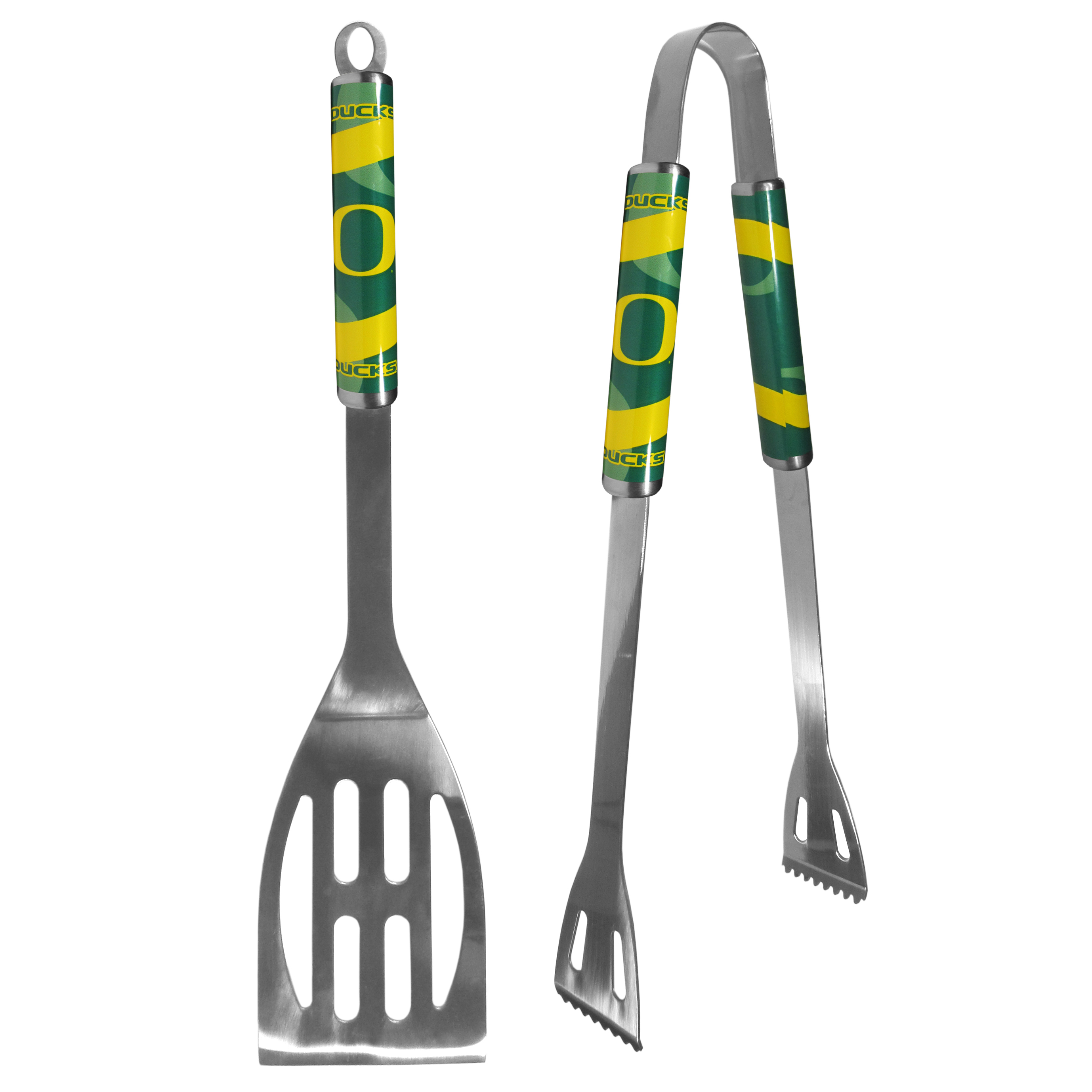 This stainless steel 2 pc BBQ set is a tailgater's best friend. The colorful and large team graphics lets everyone know you are a fan! The set in includes a spatula and tongs with the Oregon Ducks proudly display on each tool.