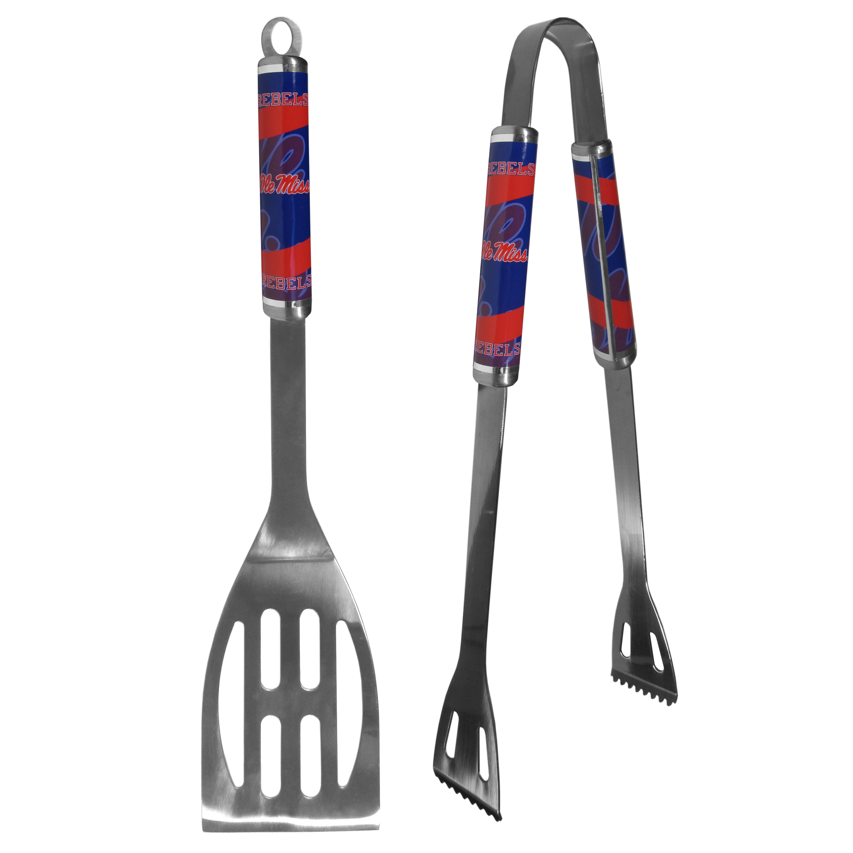 This stainless steel 2 pc BBQ set is a tailgater's best friend. The colorful and large team graphics lets everyone know you are a fan! The set in includes a spatula and tongs with the Mississippi Rebels proudly display on each tool.