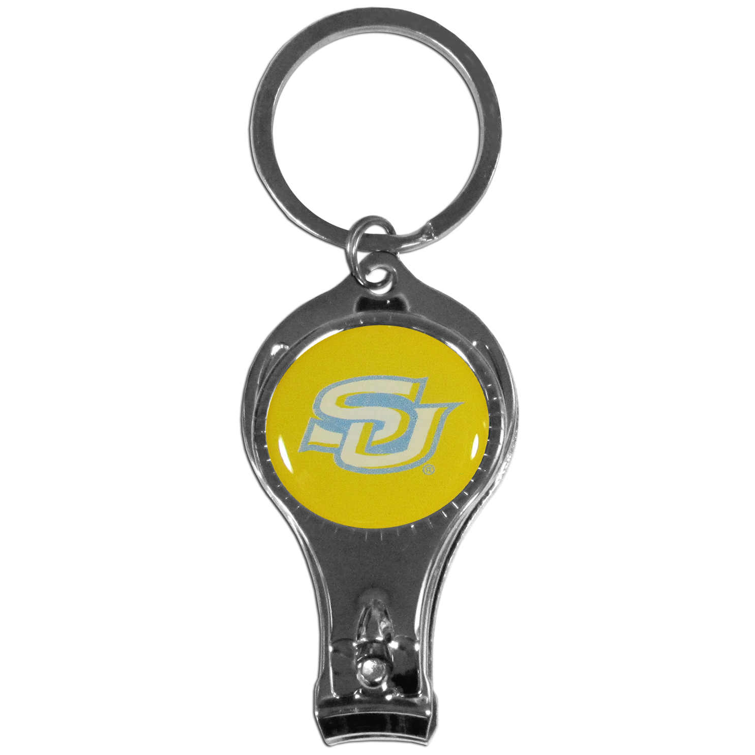 This unique Southern University Jaguars key chain has 3 great functions! The key chain opens to become a nail clipper, when open you can access the nail file pad and the key chain has a bottle opener.