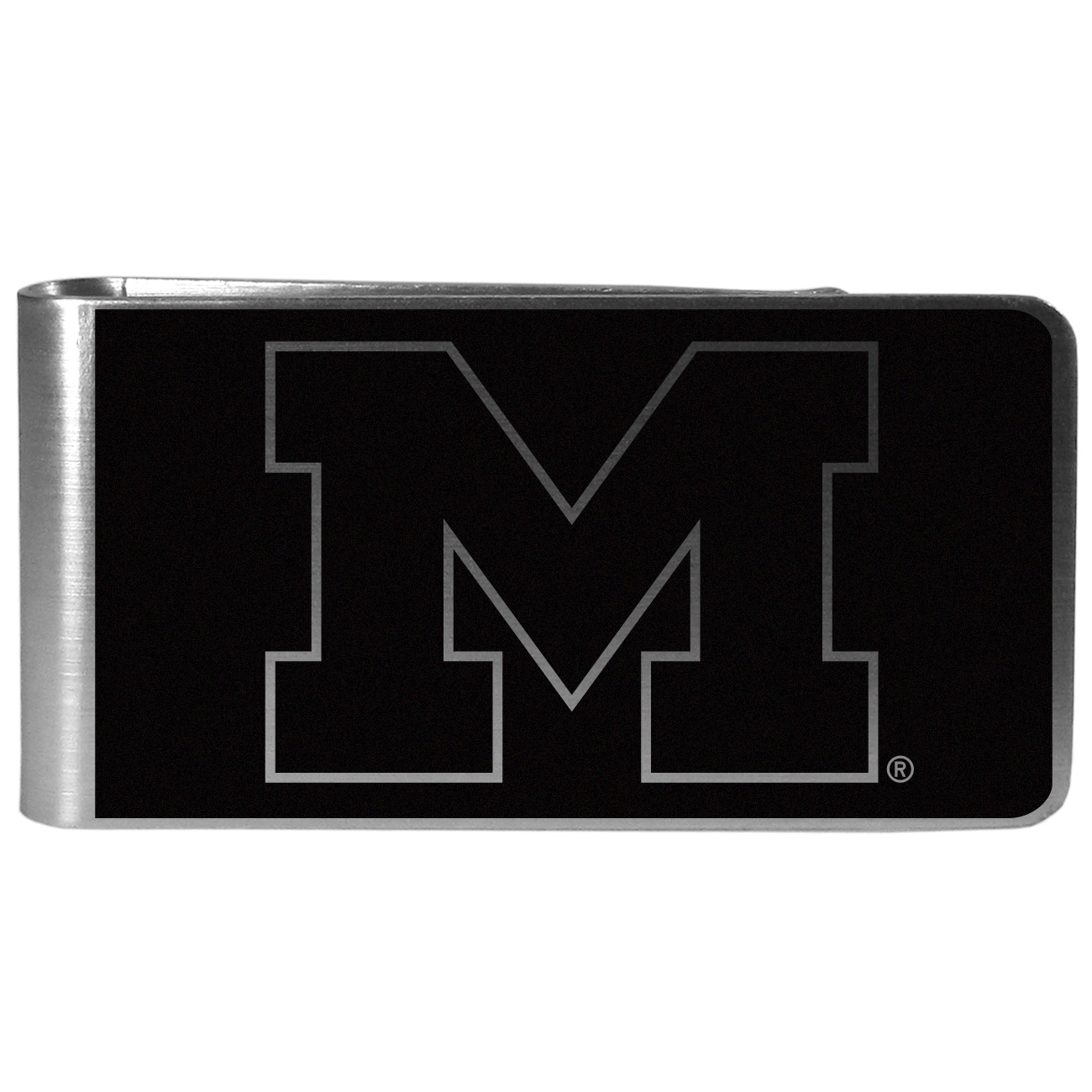 Our monochromatic steel money clips have a classic style and superior quality. The strong, steel clip has a black overlay of the Michigan Wolverines logo over the brushed metal finish creating a stylish men's fashion accessory that would make any fan proud.