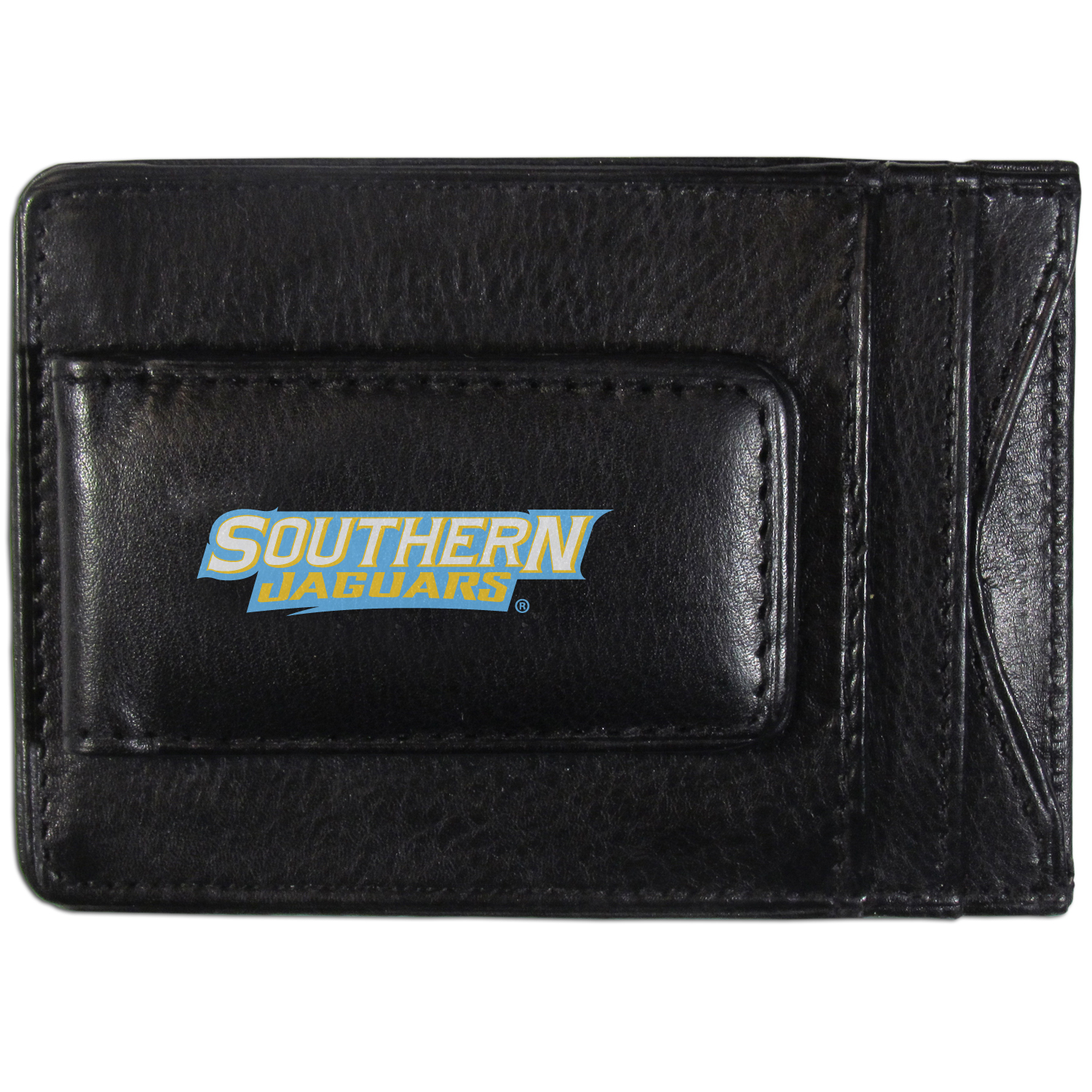 This super slim leather wallet lets you have all the benefits of a money clip while keeping the organization of a wallet. On one side of this front pocket wallet there is a strong, magnetic money clip to keep your cash easily accessible and the?Southern University Jaguars team logo on the front. The versatile men's accessory is a perfect addition to your fan apparel.