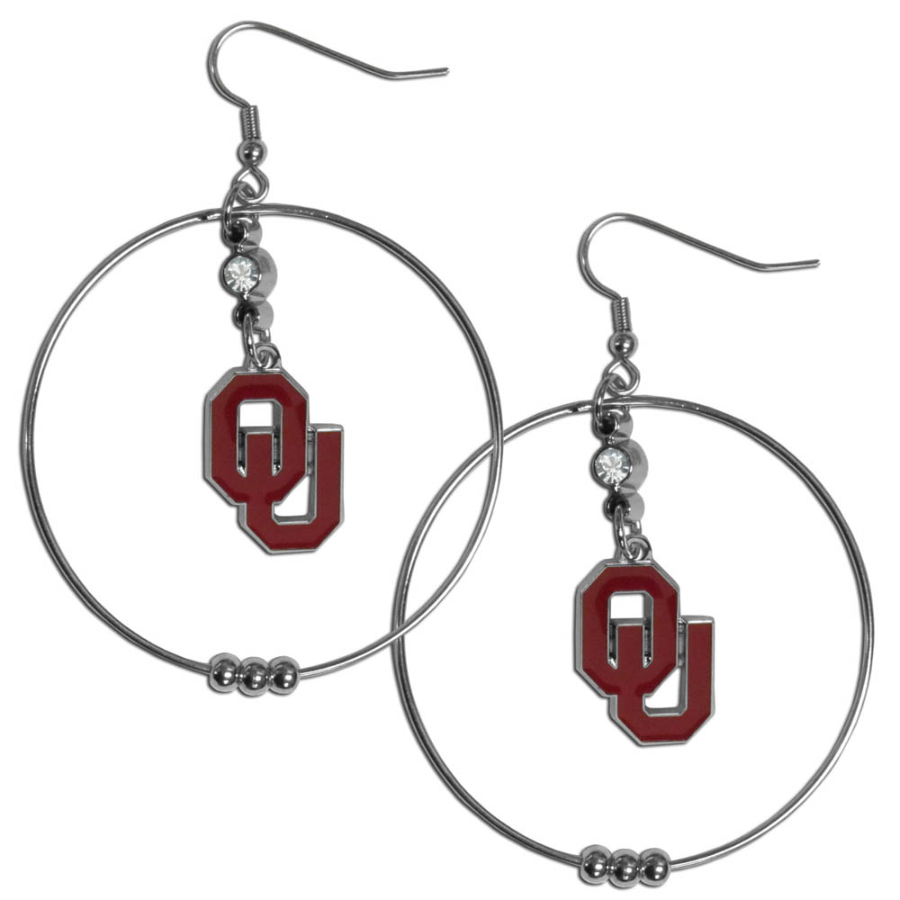 These trend-setting Oklahoma Sooners 2 inch Hoop earrings are casual and lightweight large hoops with eye catching team charm and crystal accent. These trendy earrings feature a 2 inch hoop with a floating rhinestone and team charm with carved and enameled details. Sporty meets chic with these sassy earrings that would make the perfect gift for any female fan. The perfect game-day accessory and also fun for any day.