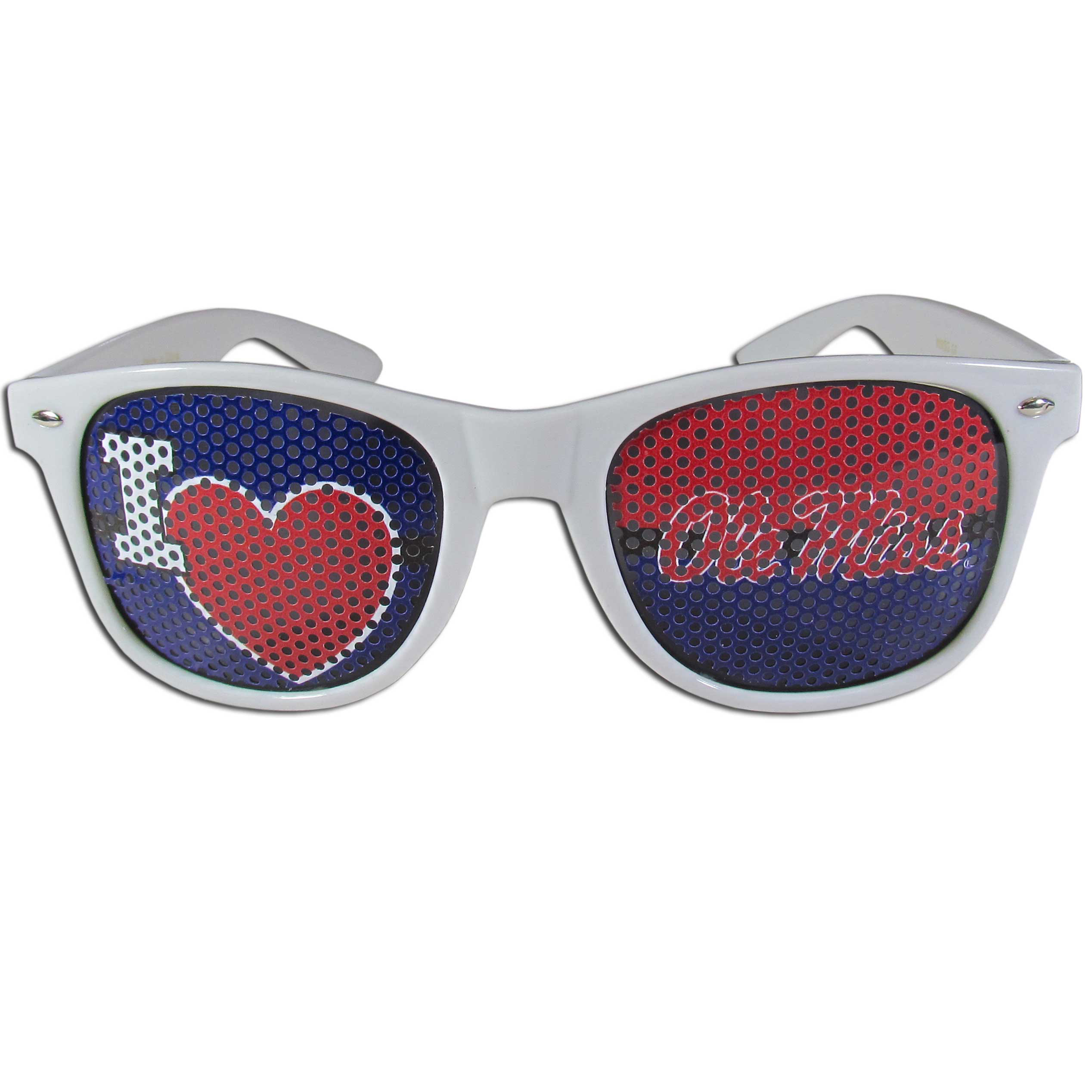 Our officially licensed I Heart game day shades are the perfect accessory for the devoted Mississippi Rebels fan! The sunglasses have durable polycarbonate frames with flex hinges for comfort and damage resistance. The lenses feature brightly colored team clings that are perforated for visibility.