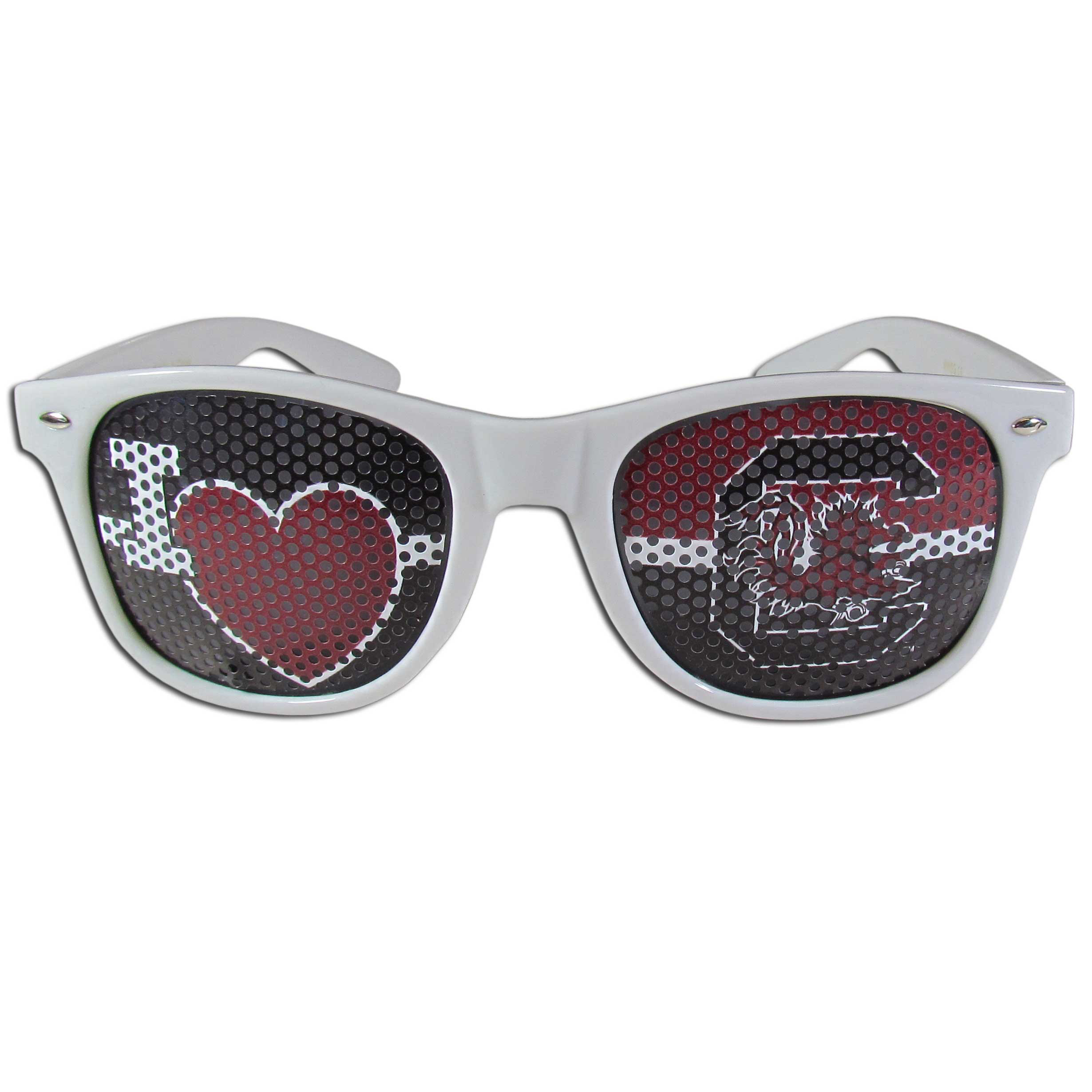 Our officially licensed I Heart game day shades are the perfect accessory for the devoted S. Carolina Gamecocks fan! The sunglasses have durable polycarbonate frames with flex hinges for comfort and damage resistance. The lenses feature brightly colored team clings that are perforated for visibility.
