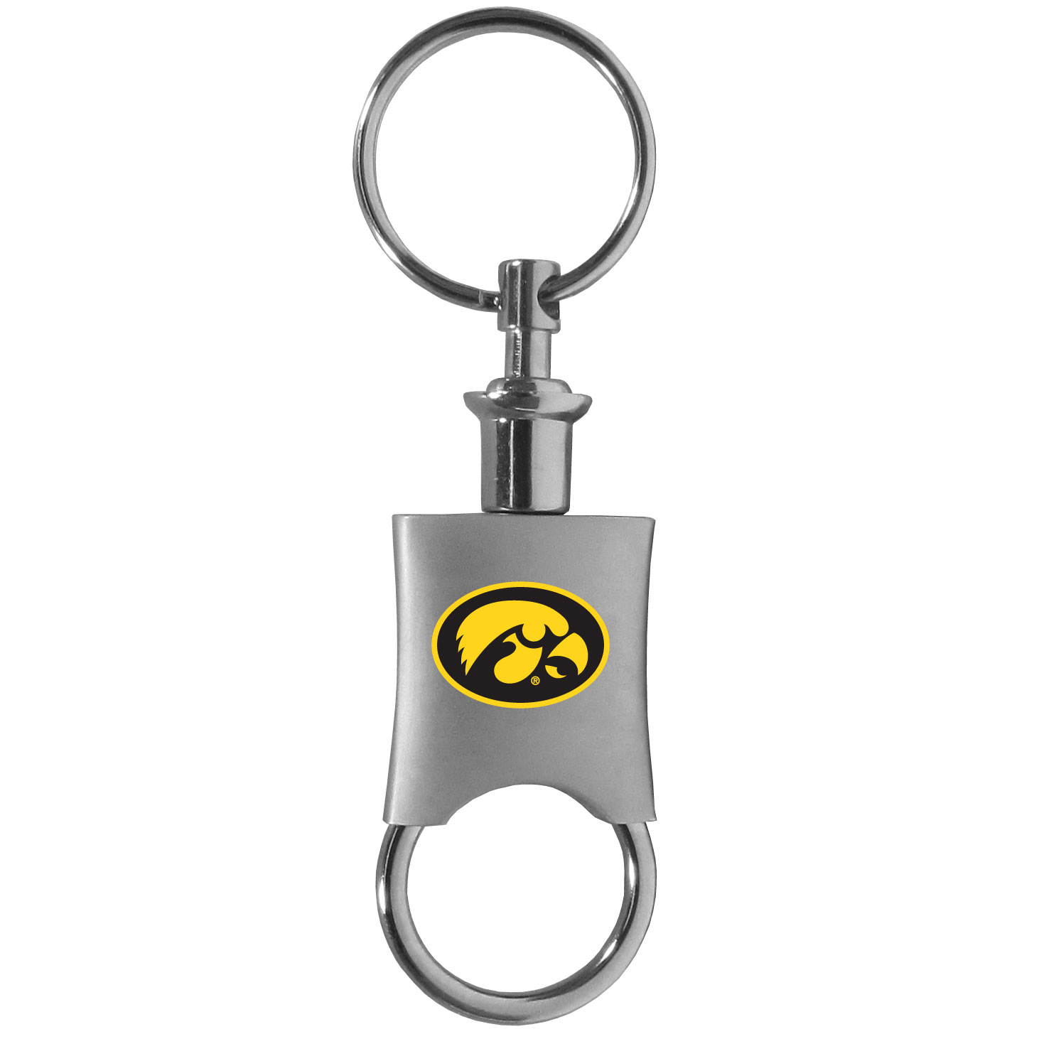 This high-quality key chain is both fashionable and functional. The key chain features two key rings and one of them detaches easily for valet use so you do not have to risk giving out all of your keys. The beautiful brushed metal finish features the Iowa Hawkeyes logo expertly printed on front.