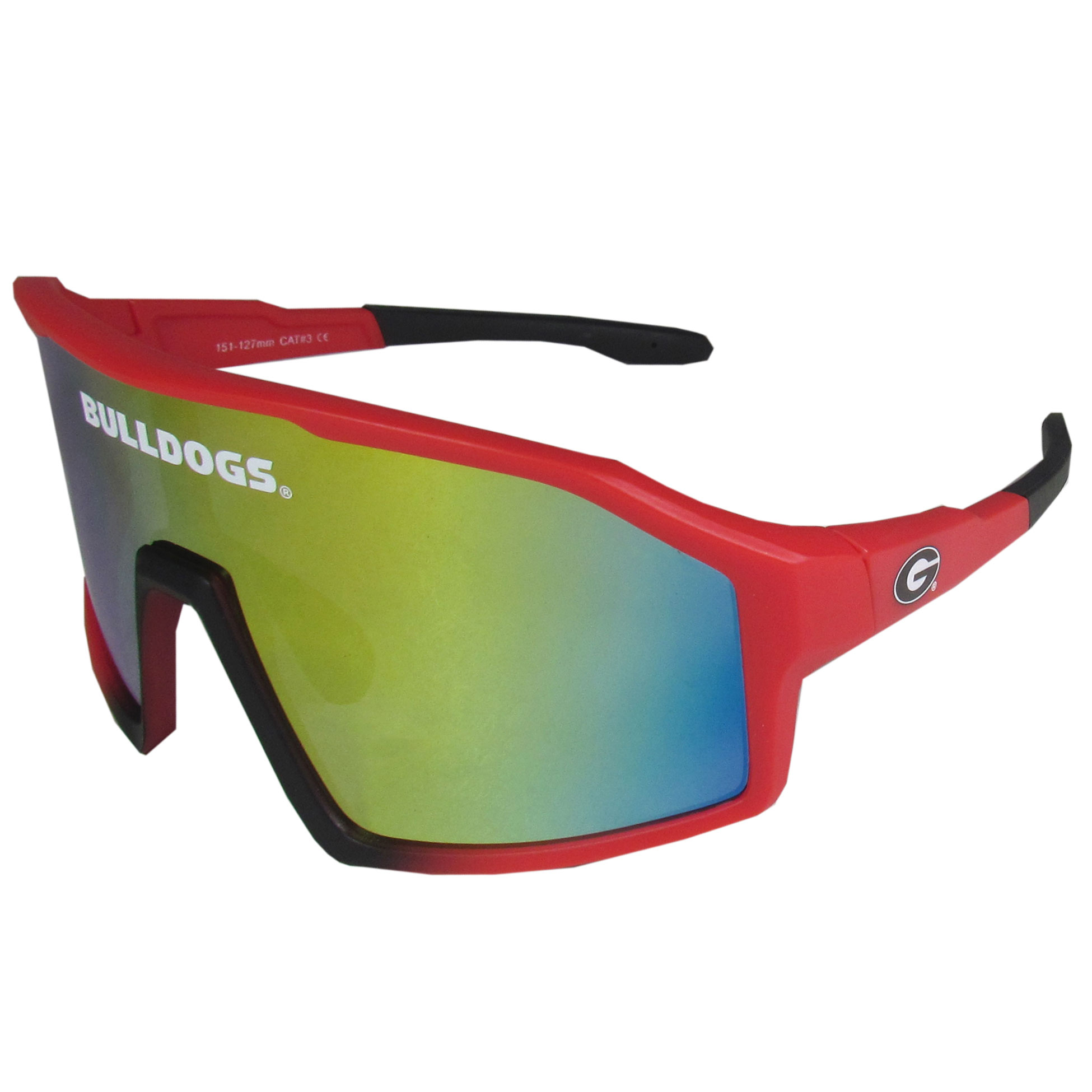 The sunglasses have a wraparound design intended to fit the lens as close to the face as possible, covering your eye and providing a wider field of view, frame retention and impact protection. The mirrored lens provides protection against glare and has the maximum UVA/UVB protection. The stylish shades feature the team name across the lens and the Georgia Bulldogs logo on the arms.