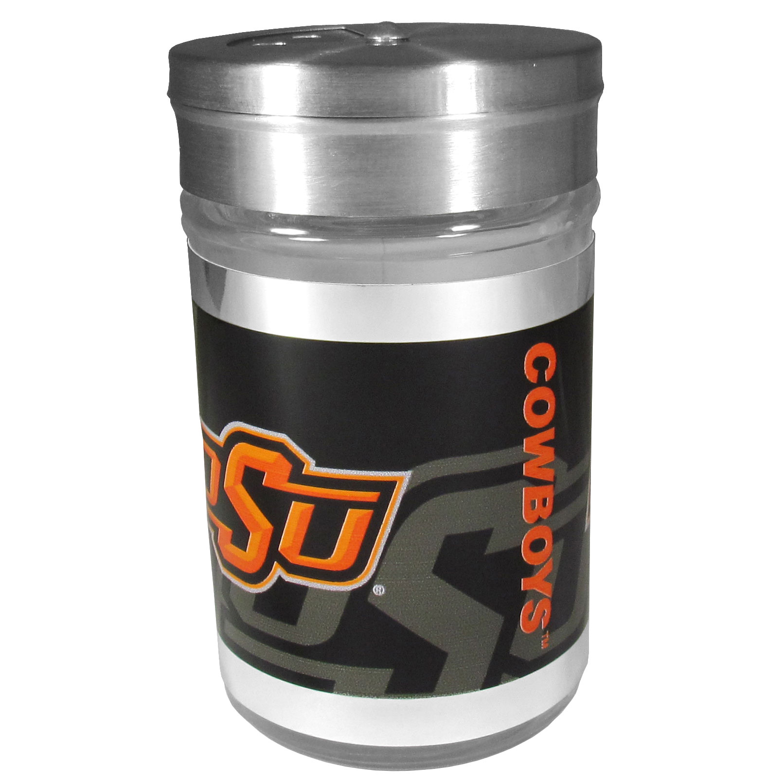 Spice it up with our Oklahoma St. Cowboys tailgater season shakers! This compact shaker is 2 inch tall with a twist top that closes off the holes at the top making it perfect for travel preventing those messy spills. The shaker has wide holes perfect for keeping your pepper seeds or cheese toppings. The bright team graphics will make you the envy of the other fans while you are grilling up your tailgating goodies.