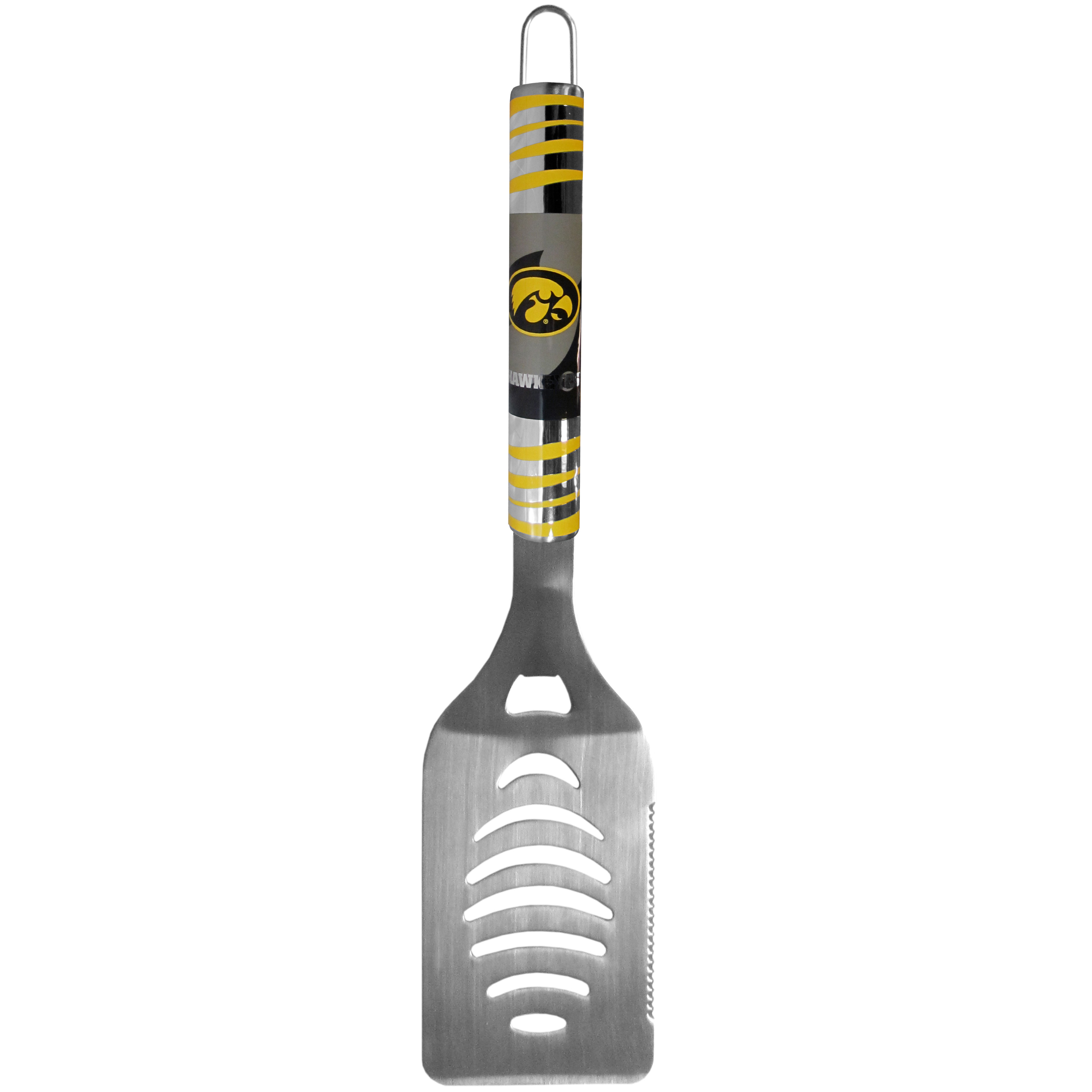 Our tailgater spatula really catches your eye with flashy chrome accents and vivid Iowa Hawkeyes digital graphics. The 420 grade stainless steel spatula is a tough, heavy-duty tool that will last through years of tailgating fun. The spatula features a bottle opener and sharp serrated edge.