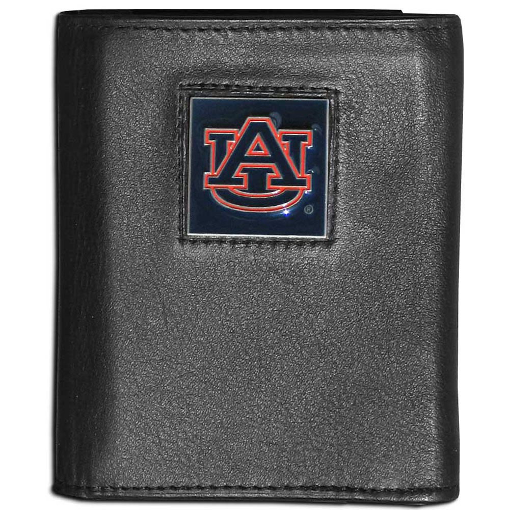 Our Auburn Tigers leather tri-fold wallet features a sculpted and hand painted team square on a black leather tri-fold. Includes an ID window, slots for credit cards and clear plastic photo sleeves. For a sporty feel, the liner of the wallet is made with a canvas liner.