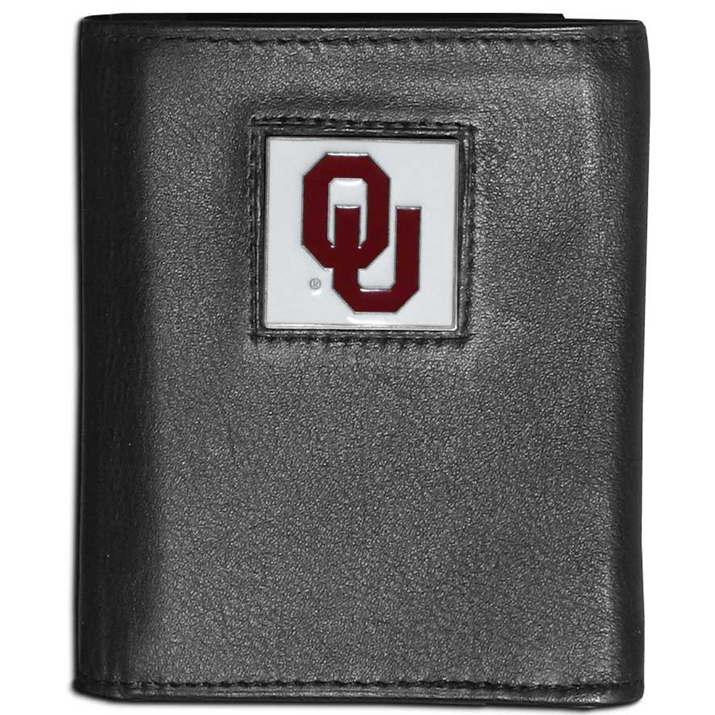 Our Oklahoma Sooners leather tri-fold wallet features a sculpted and hand painted team square on a black leather tri-fold. Includes an ID window, slots for credit cards and clear plastic photo sleeves. For a sporty feel, the liner of the wallet is made with a canvas liner.