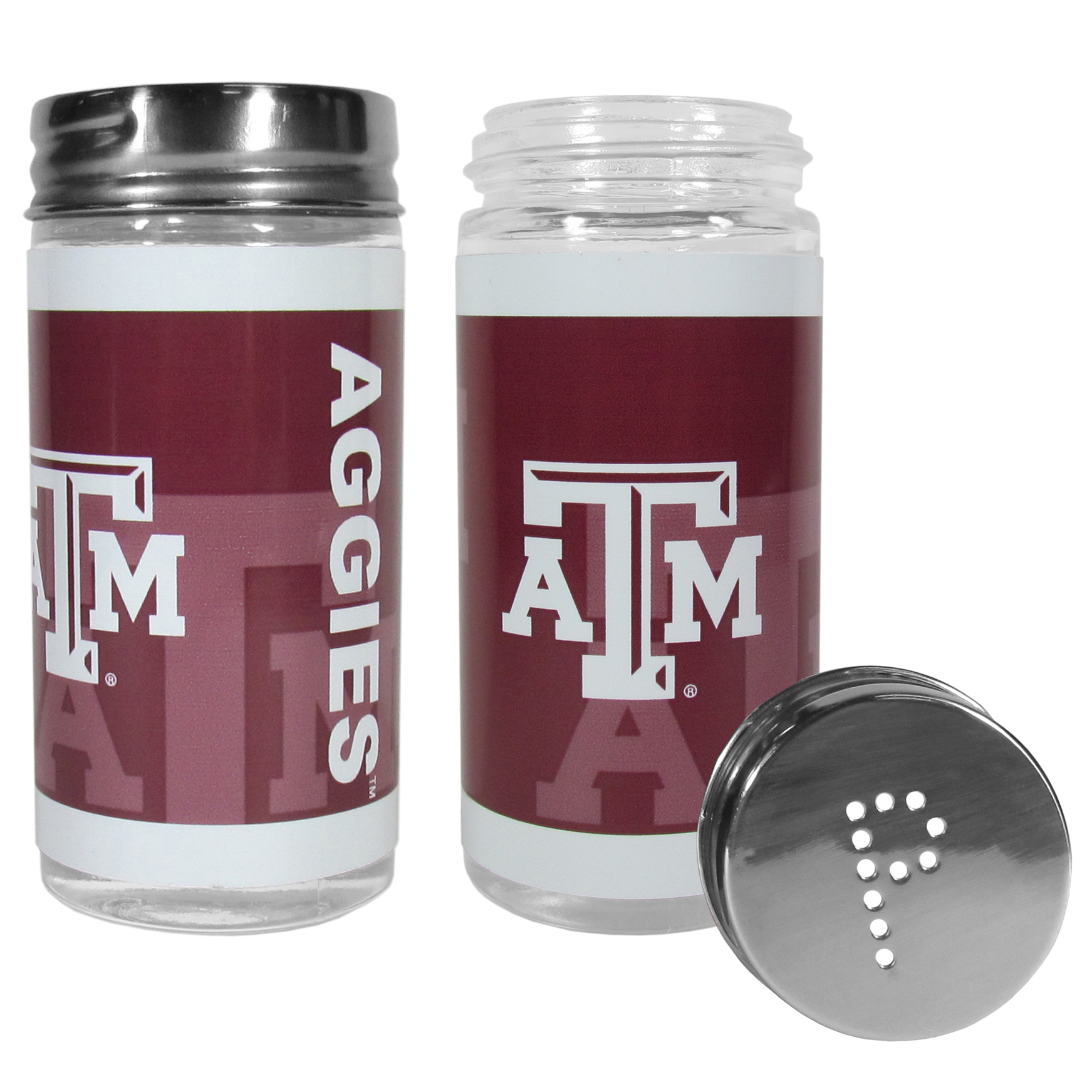 No tailgate party is complete without your Texas A & M Aggies salt & pepper shakers featuring bright team graphics. The glass shakers are 3.75 inches tall and the screw top lids have holes that spell out P and S. These team shakers are a great grill accessory whether you are barbecuing on the patio, picnicing or having a game day party.