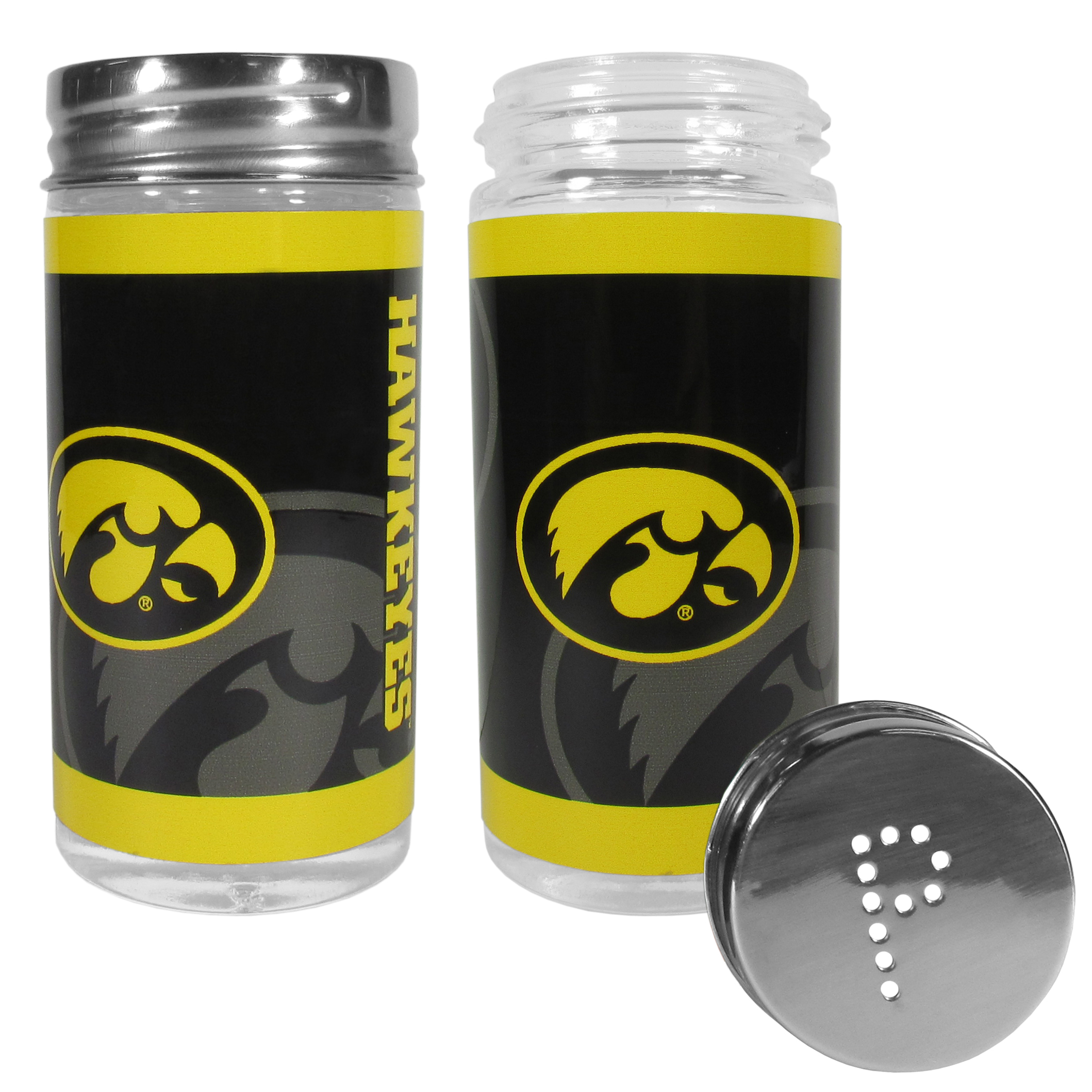 No tailgate party is complete without your Iowa Hawkeyes salt & pepper shakers featuring bright team graphics. The glass shakers are 3.75 inches tall and the screw top lids have holes that spell out P and S. These team shakers are a great grill accessory whether you are barbecuing on the patio, picnicing or having a game day party.