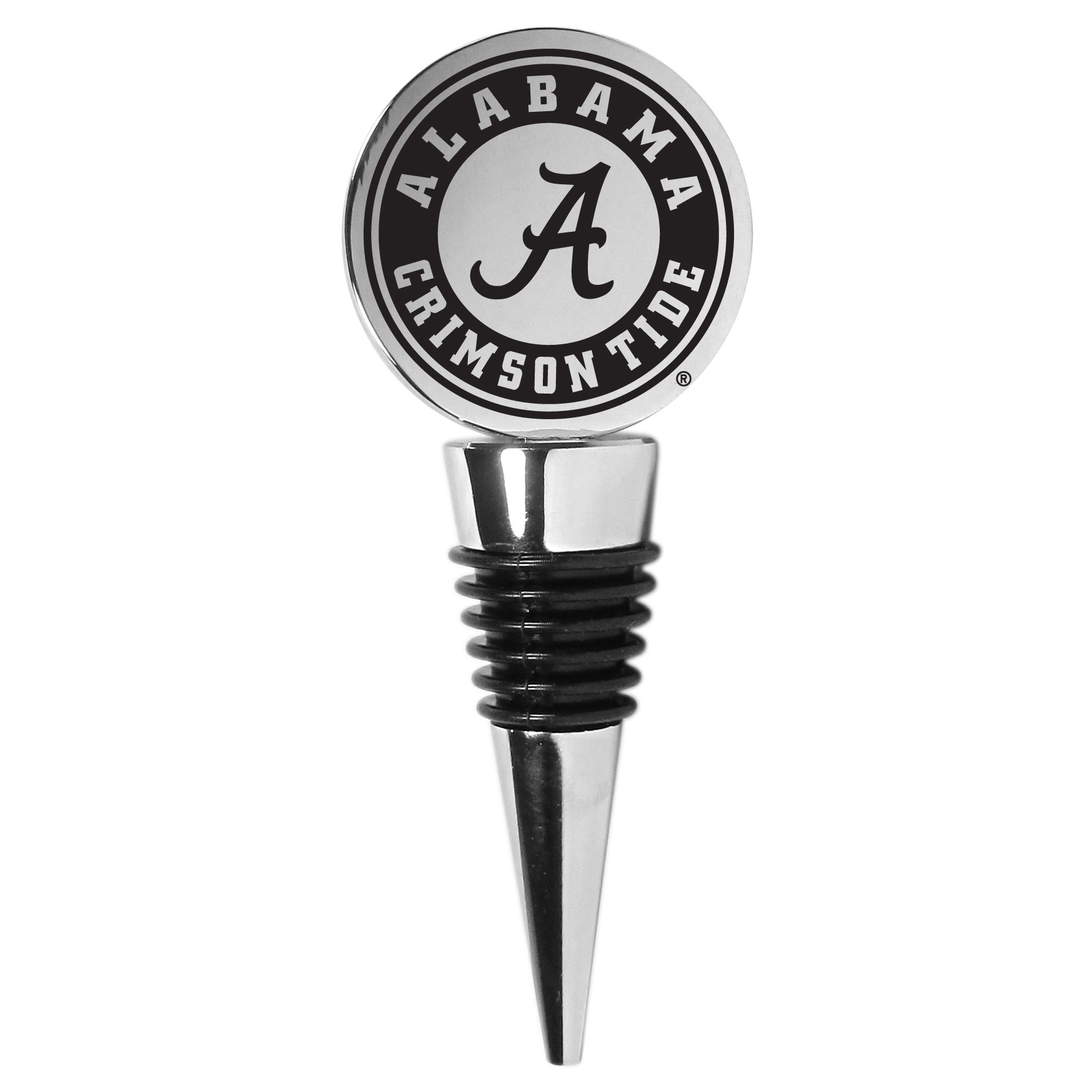 This beautiful Alabama Crimson Tide wine stopper has a classy monochromatic logo on the top disc. The tapered rubber rings allow you to create a tight seal on multiple sizes of wine bottles so that you are able to preserve the wine for later enjoyment. This a perfect addition to a game day celebration.