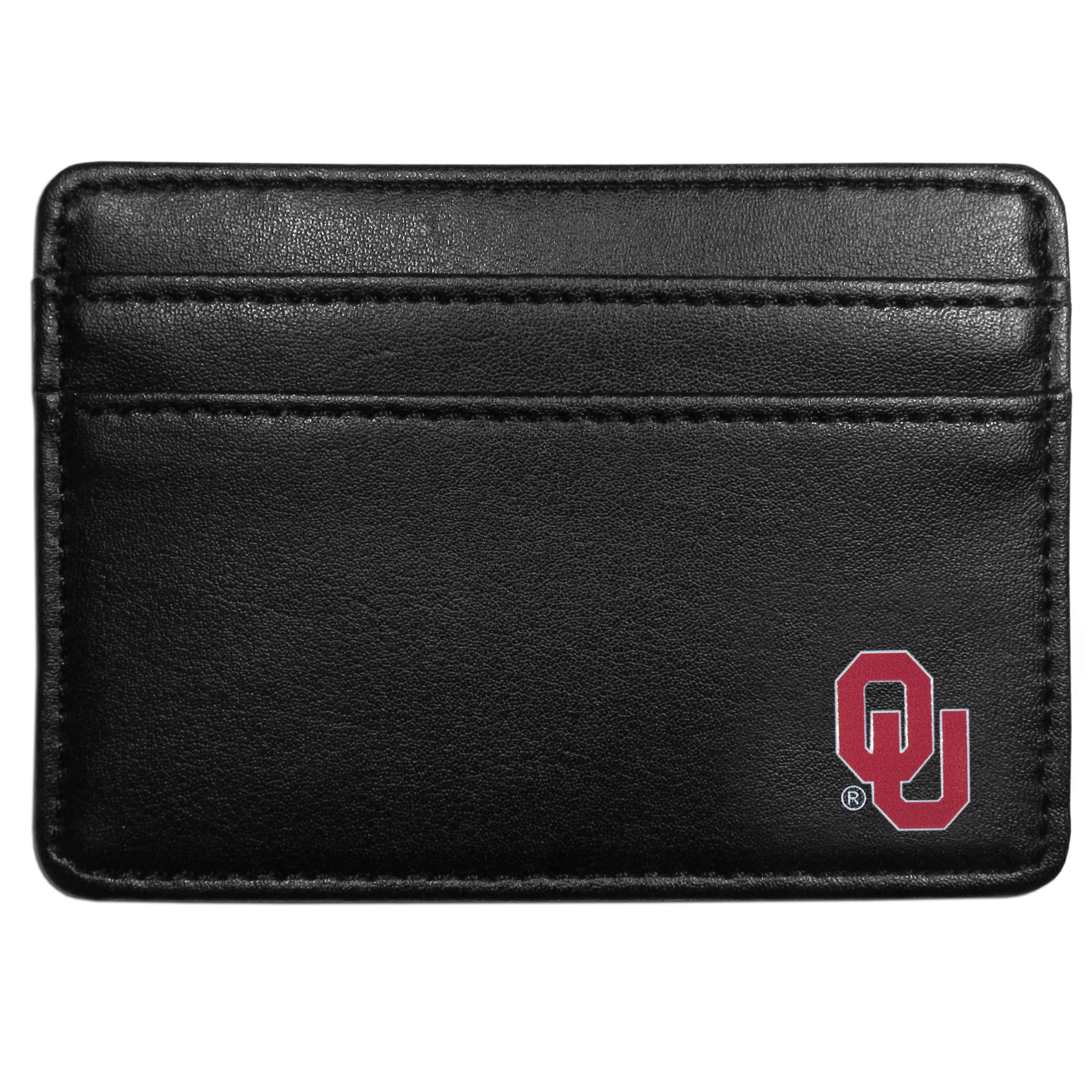 Ditch your bulky wallet! This super slim leather wallet is the perfect weekend companion and sports fan accessory. The compact design features 2 credit card slots on the front and one on the back and an inner middle pocket for cash. The front of the wallet has a crisp silk screened Oklahoma Sooners team logo. This front pocket wallet is just slightly larger than a credit card and super slim but with the inner pocket and outer slots it still can hold everything that you need.
