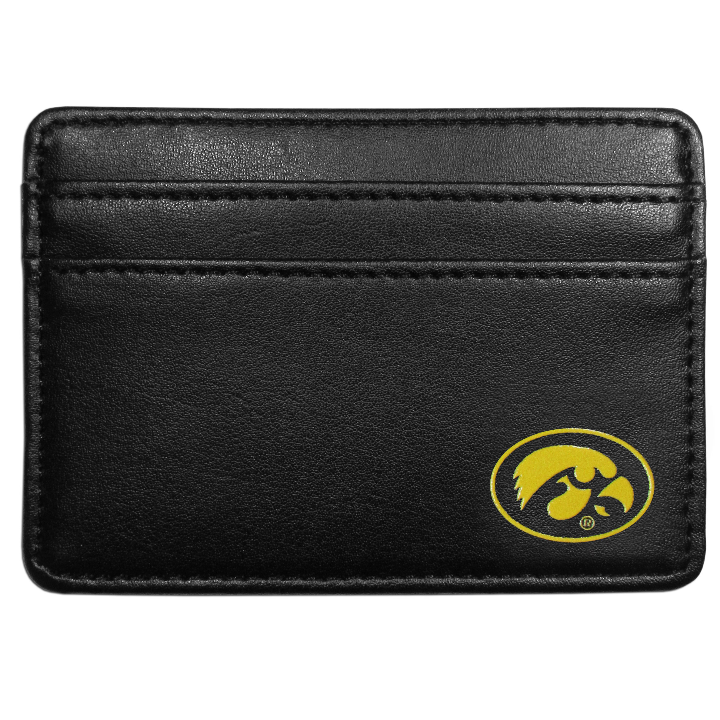 Ditch your bulky wallet! This super slim leather wallet is the perfect weekend companion and sports fan accessory. The compact design features 2 credit card slots on the front and one on the back and an inner middle pocket for cash. The front of the wallet has a crisp silk screened Iowa Hawkeyes team logo. This front pocket wallet is just slightly larger than a credit card and super slim but with the inner pocket and outer slots it still can hold everything that you need.