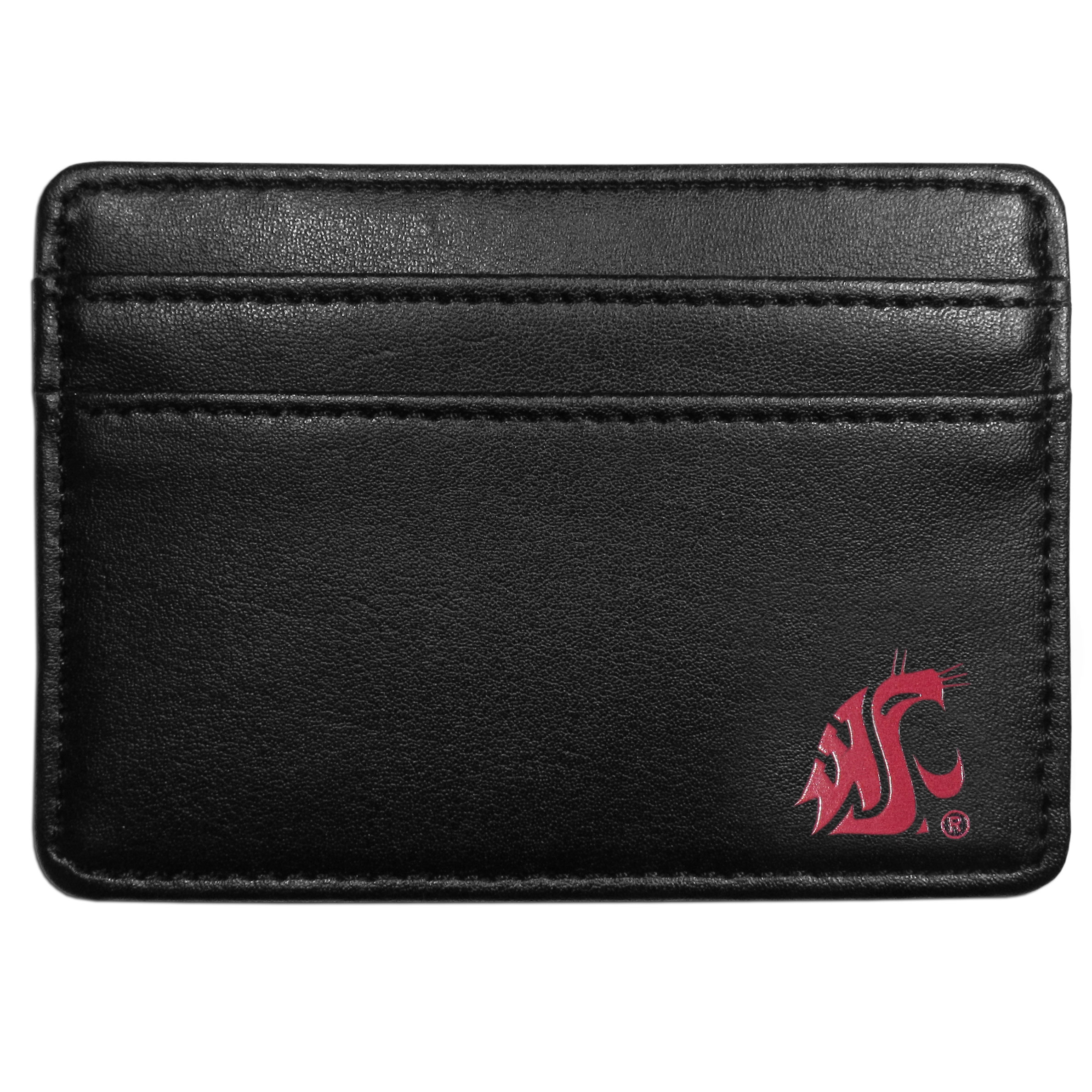 Ditch your bulky wallet! This super slim leather wallet is the perfect weekend companion and sports fan accessory. The compact design features 2 credit card slots on the front and one on the back and an inner middle pocket for cash. The front of the wallet has a crisp silk screened Washington St. Cougars team logo. This front pocket wallet is just slightly larger than a credit card and super slim but with the inner pocket and outer slots it still can hold everything that you need.