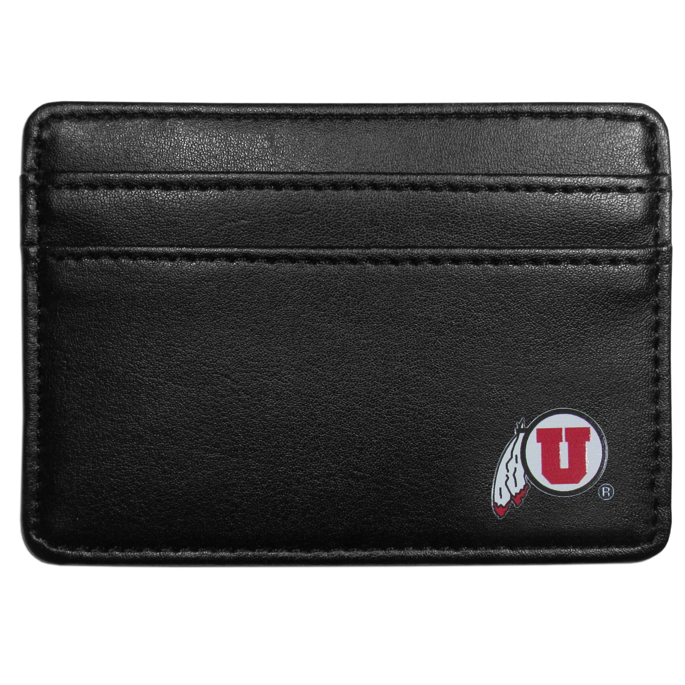 Ditch your bulky wallet! This super slim leather wallet is the perfect weekend companion and sports fan accessory. The compact design features 2 credit card slots on the front and one on the back and an inner middle pocket for cash. The front of the wallet has a crisp silk screened Utah Utes team logo. This front pocket wallet is just slightly larger than a credit card and super slim but with the inner pocket and outer slots it still can hold everything that you need.