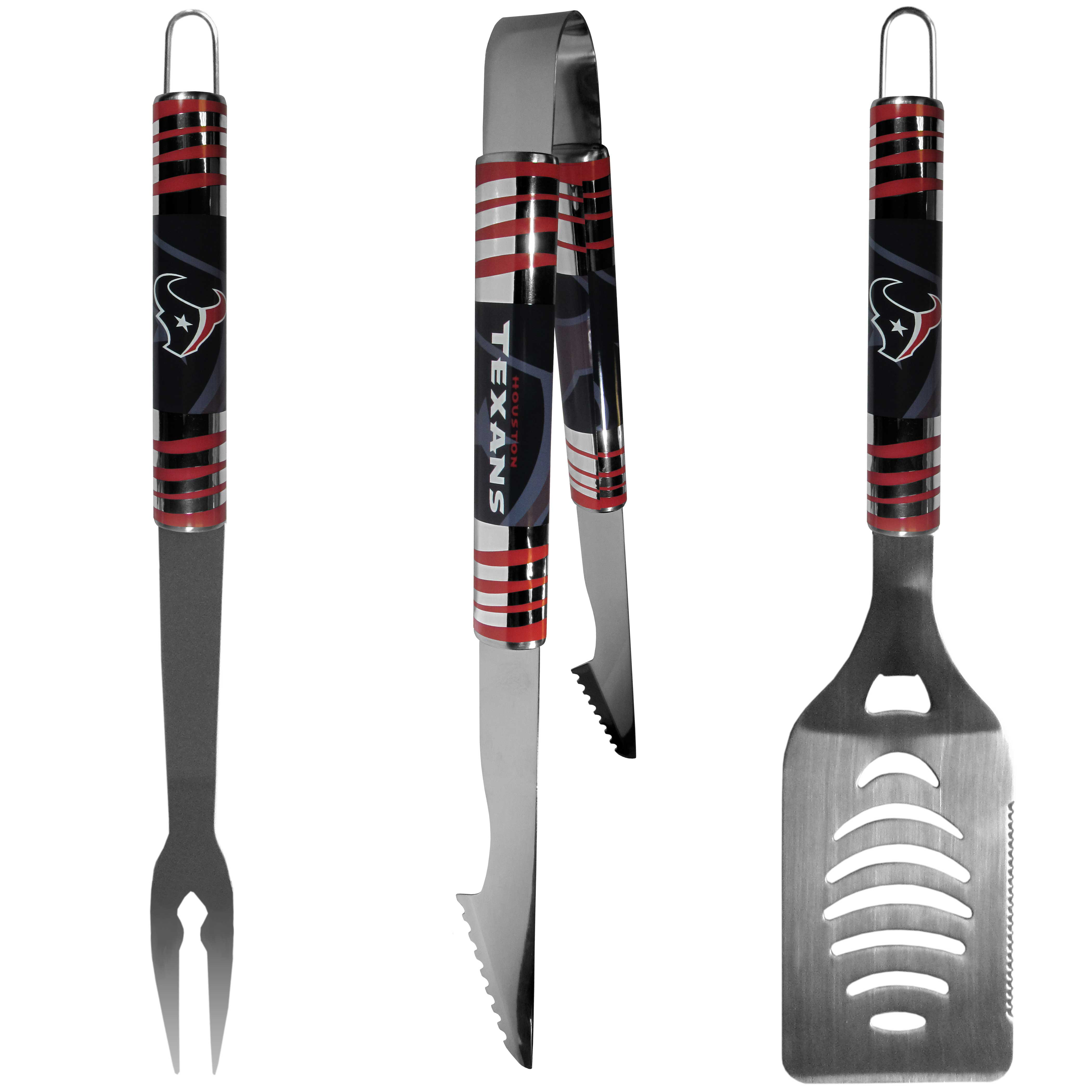 The eye-catching chrome graphics on this set make it a game day favorite! The high-quality, 420 grade stainless steel 3 pc Houston Texans BBQ grill set will make any grill master smile. These barbeque tools are made to last whether you are using them for camping, tailgating or a patio party you will have quality grill tools for years to come. The set includes a large spatula with a bottle opener feature and sharp serrated edge, strong tongs and fork. The 16 inch length keeps you far from the flames. The quality of the tools make them a great choice for Father's Day or Christmas gifts, they are really a grill accessory must have.