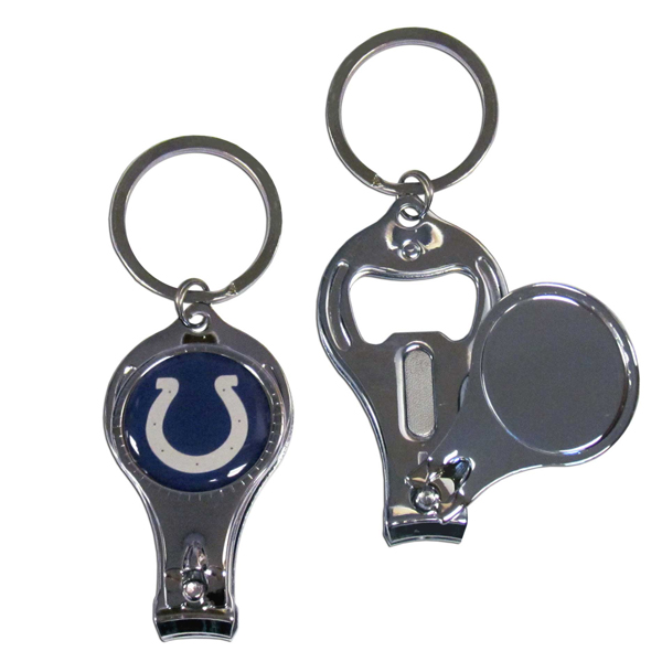 This unique Indianapolis Colts key chain has 3 great functions! The key chain opens to become a nail clipper, when open you can access the nail file pad and the key chain has a bottle opener.