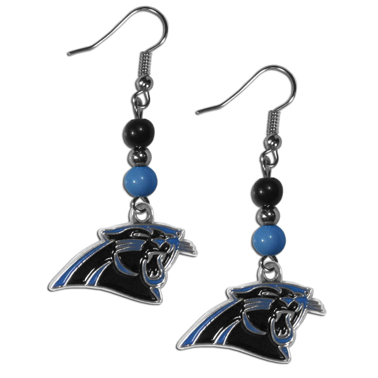 These fun and colorful Carolina Panthers Fan Bead earrings are casual and lightweight fashion dangle earring with eye-catching team charm. These fun dangle earrings feature a team colored beads drop down to a carved and enameled charm. These sassy yet sporty earrings make the perfect gift for any female fan. Spice up your game-day outfit with these fun colorful earrings, they are the perfect accessory and also cute enough for any day.