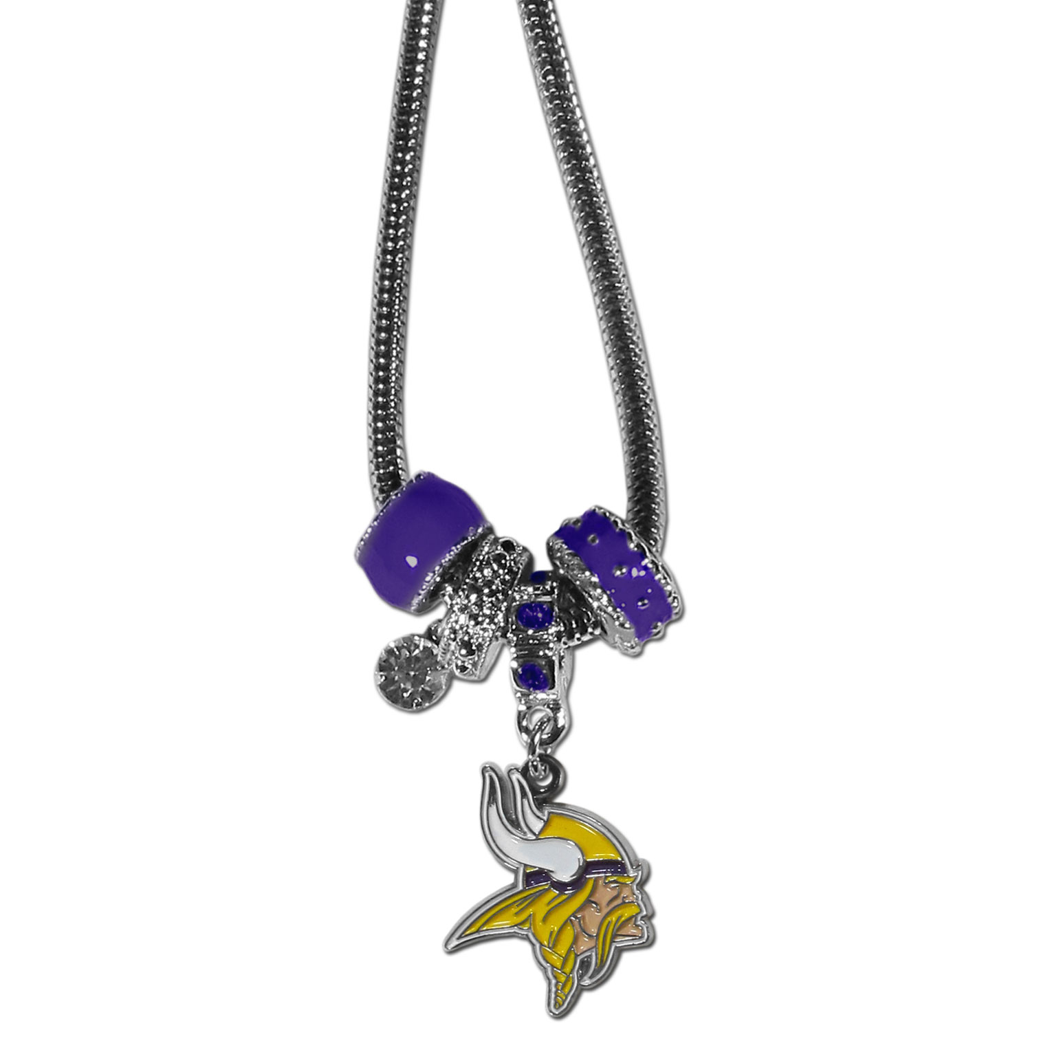 We have combined the wildly popular Euro style beads with your favorite team to create our Minnesota Vikings bead necklace. The 18 inch snake chain features 4 Euro beads with enameled team colors and rhinestone accents with a high polish, nickel free charm and rhinestone charm. Perfect way to show off your team pride.
