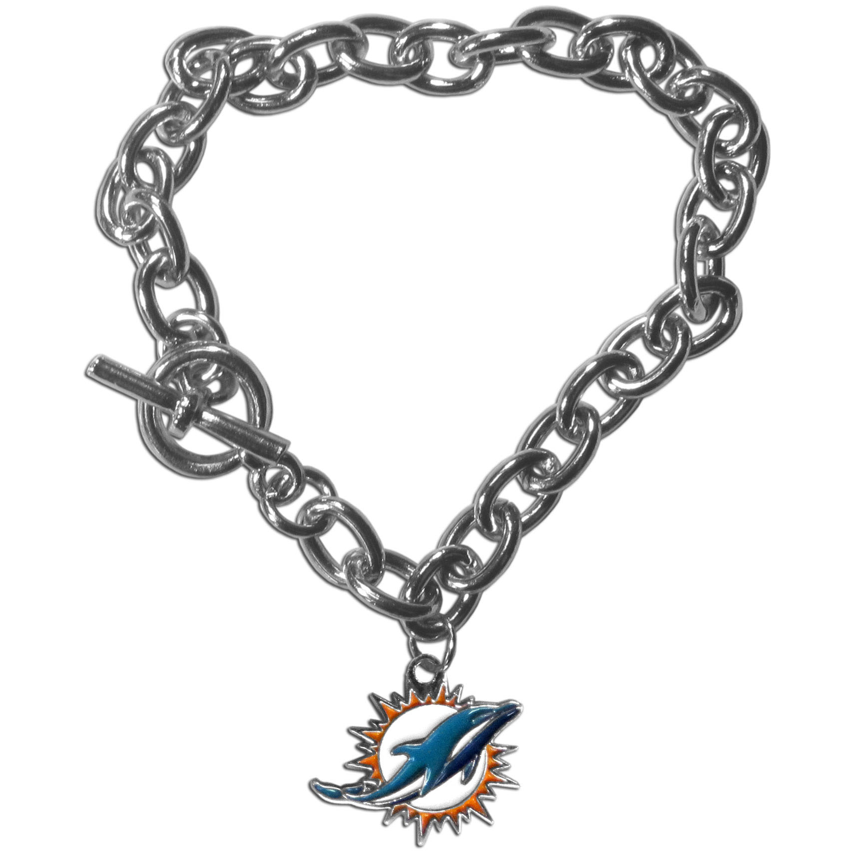 Our classic single charm bracelet is a great way to show off your team pride! The 7.5 inch large link chain features a high polish Miami Dolphins charm and features a toggle clasp which makes it super easy to take on and off.