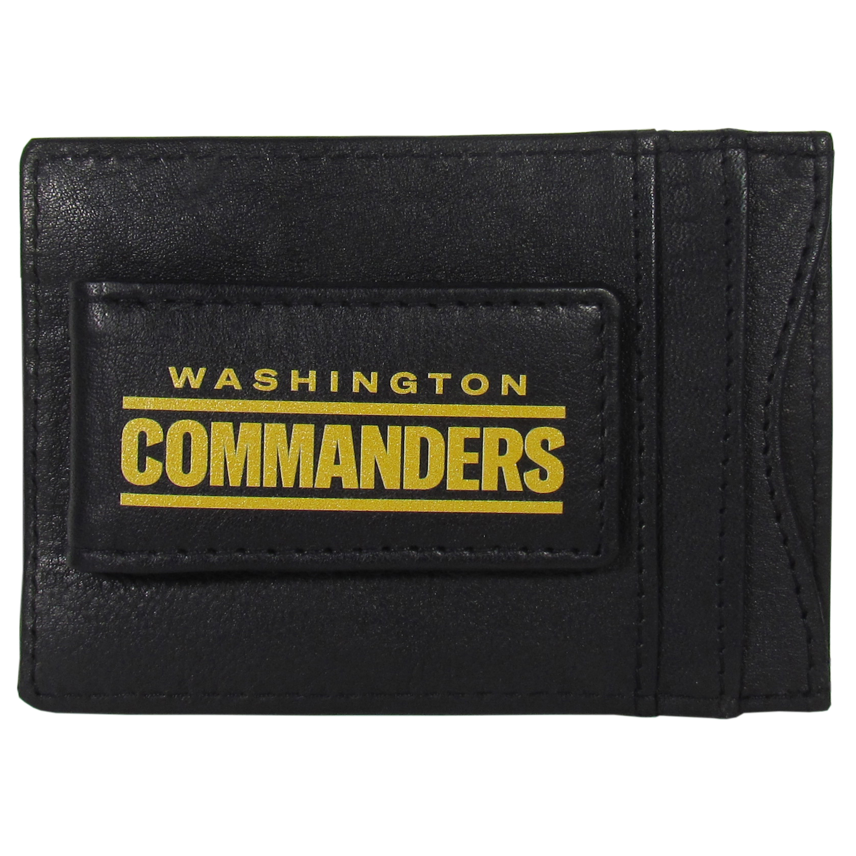 This super slim leather wallet lets you have all the benefits of a money clip while keeping the organization of a wallet. On one side of this front pocket wallet there is a strong, magnetic money clip to keep your cash easily accessible and the Washington Commanders team logo on the front. The versatile men's accessory is a perfect addition to your fan apparel.