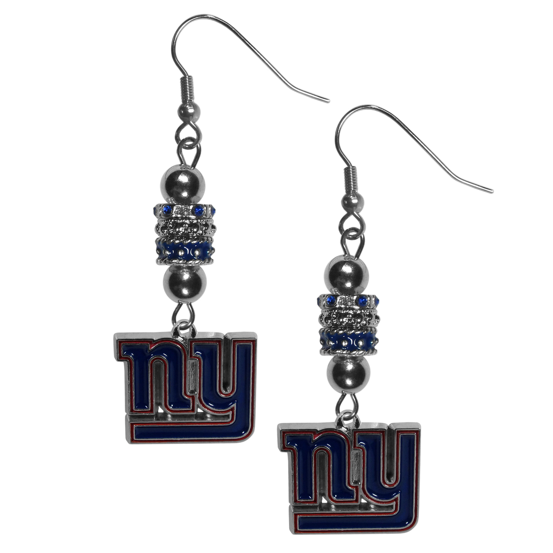 These must-have earrings are designer inspired with the trendy euro style beads and an eye catching team charm to create eye-catching New York Giants euro bead earrings. These contemporary earrings feature 3 euro beads and one team charm with carved details and enameled details. Sporty meets fashion with these sassy earrings that would make the perfect gift for any female fan. These trend-setting earrings are perfect for game-day but chic enough for any day.