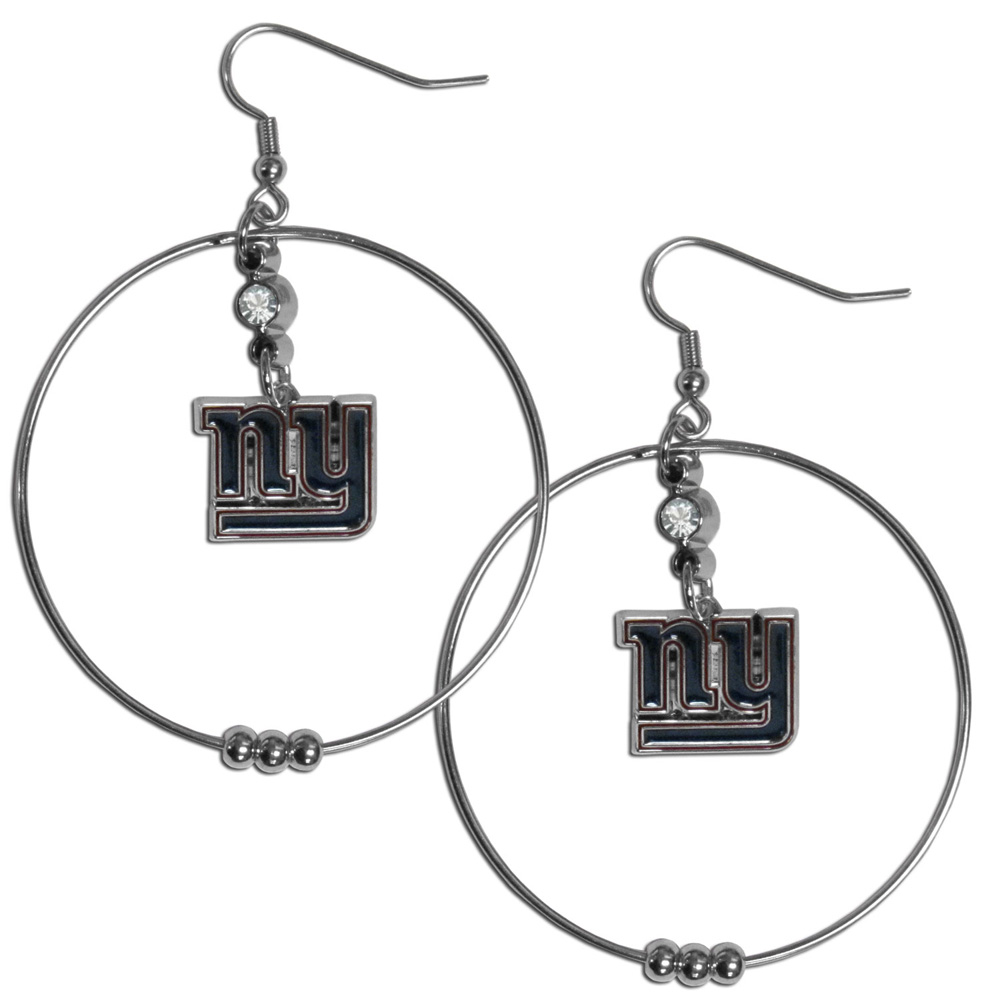 These trend-setting New York Giants 2 inch Hoop earrings are casual and lightweight large hoops with eye catching team charm and crystal accent. These trendy earrings feature a 2 inch hoop with a floating rhinestone and team charm with carved and enameled details. Sporty meets chic with these sassy earrings that would make the perfect gift for any female fan. The perfect game-day accessory and also fun for any day.