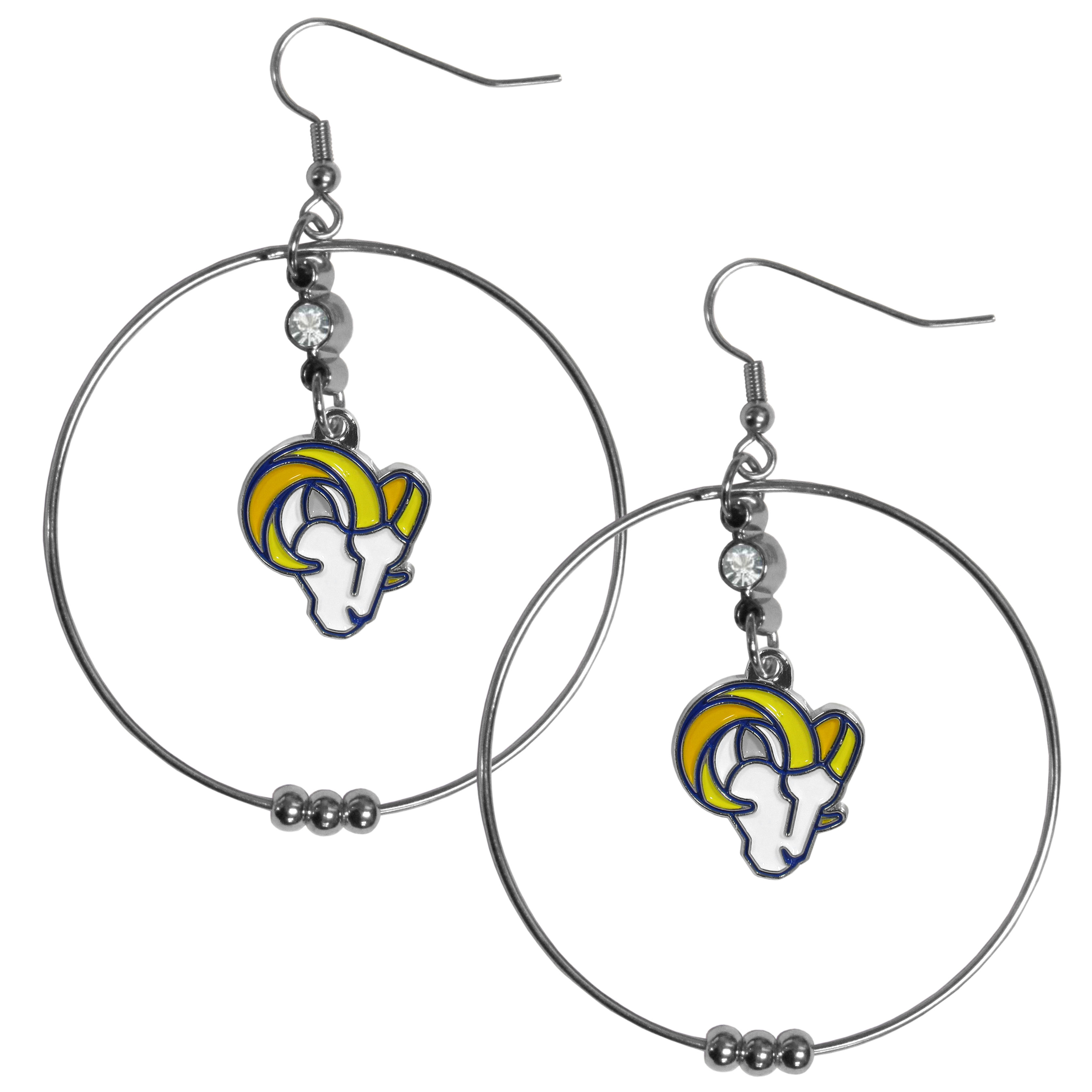 These trend-setting Los Angeles Rams 2 inch Hoop earrings are casual and lightweight large hoops with eye catching team charm and crystal accent. These trendy earrings feature a 2 inch hoop with a floating rhinestone and team charm with carved and enameled details. Sporty meets chic with these sassy earrings that would make the perfect gift for any female fan. The perfect game-day accessory and also fun for any day.
