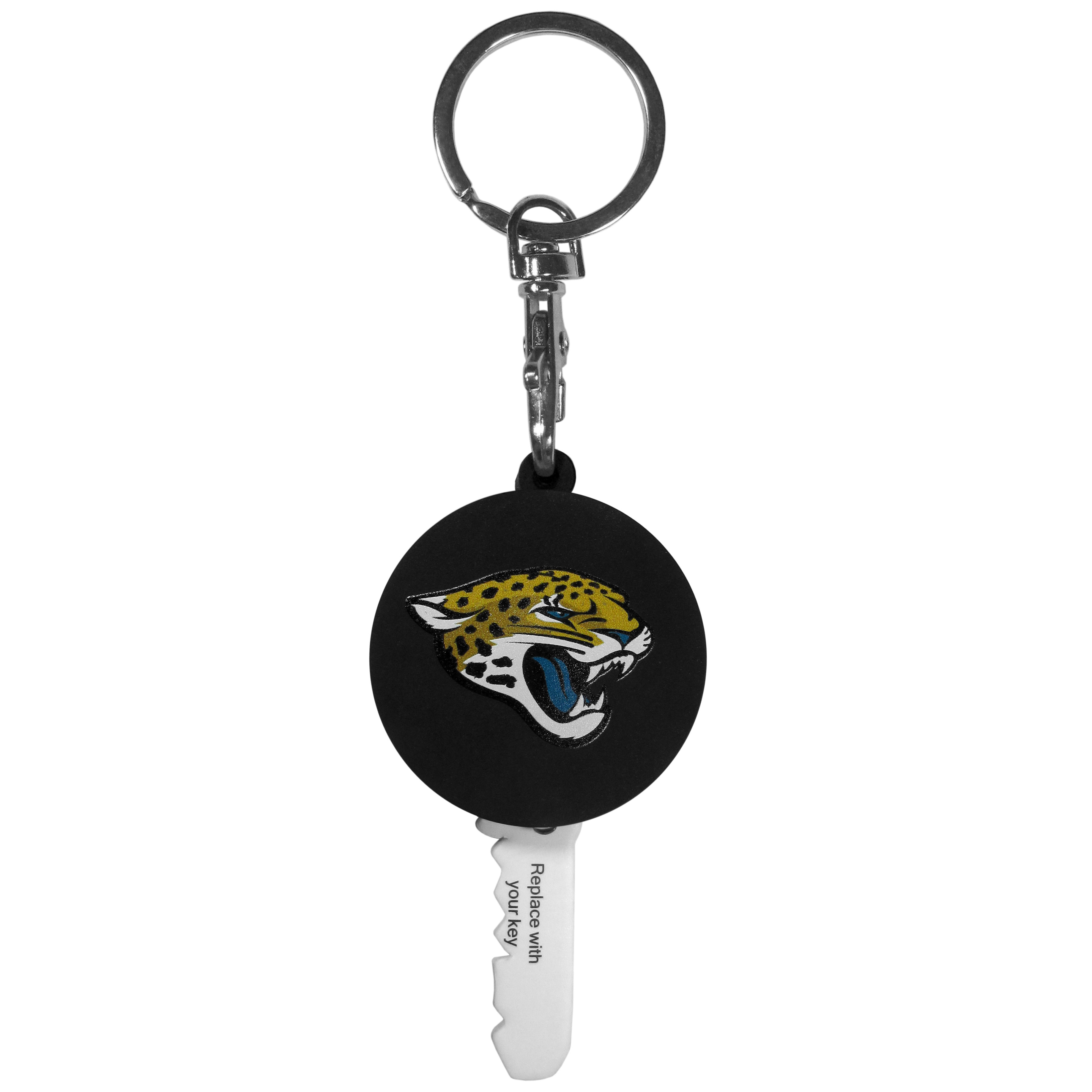 This super handy little key topper has a built in mini light that illuminates the lock so you do not have to fumble in the dark trying to open your door. You slide your house key into the top of the rubber key topper and you're ready to go. The topper features a Jacksonville Jaguars logo on the front of the topper.