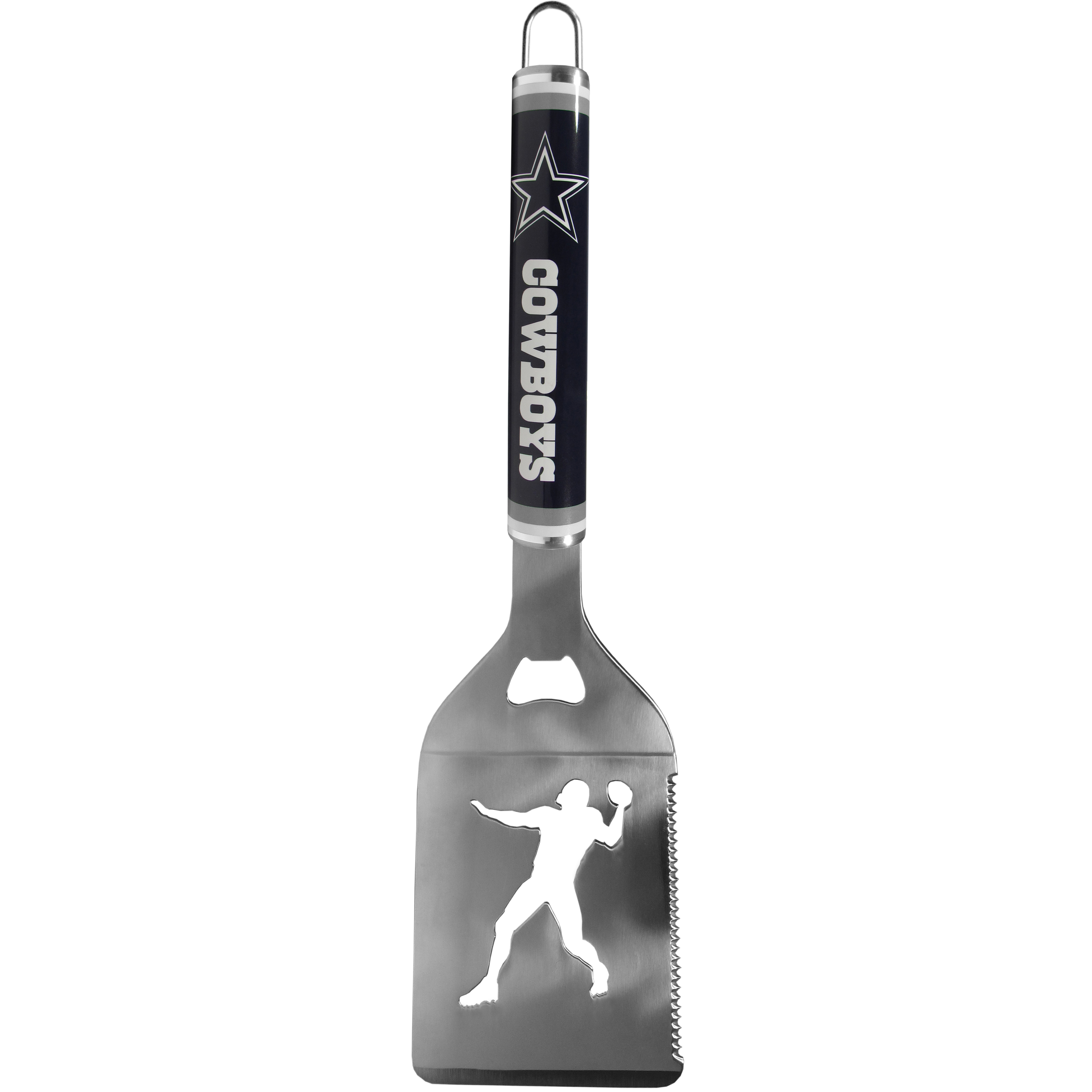 Our tailgater spatula really catches your eye with vivid Dallas Cowboys digital graphics. The 430 grade stainless steel spatula is a tough, heavy-duty tool that will last through years of tailgating fun. The spatula features a bottle opener and sharp serrated edge.