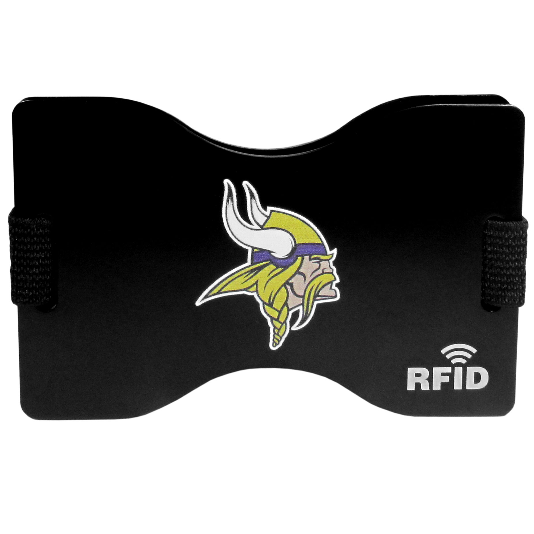 Our RFID blocking wallet and moneyclip is designed to help protect you from falling victim to a particular brand of electronic pickpocketing call RFID skimming. RFID skimming allows a criminal to scan your cards with chips and read your personal information. This attractive Minnesota Vikings wallet protects against this threat while also meeting all of your slim wallet needs. Store your cards in between the expandable RFID plates and store you cash in the handy outer money clip.