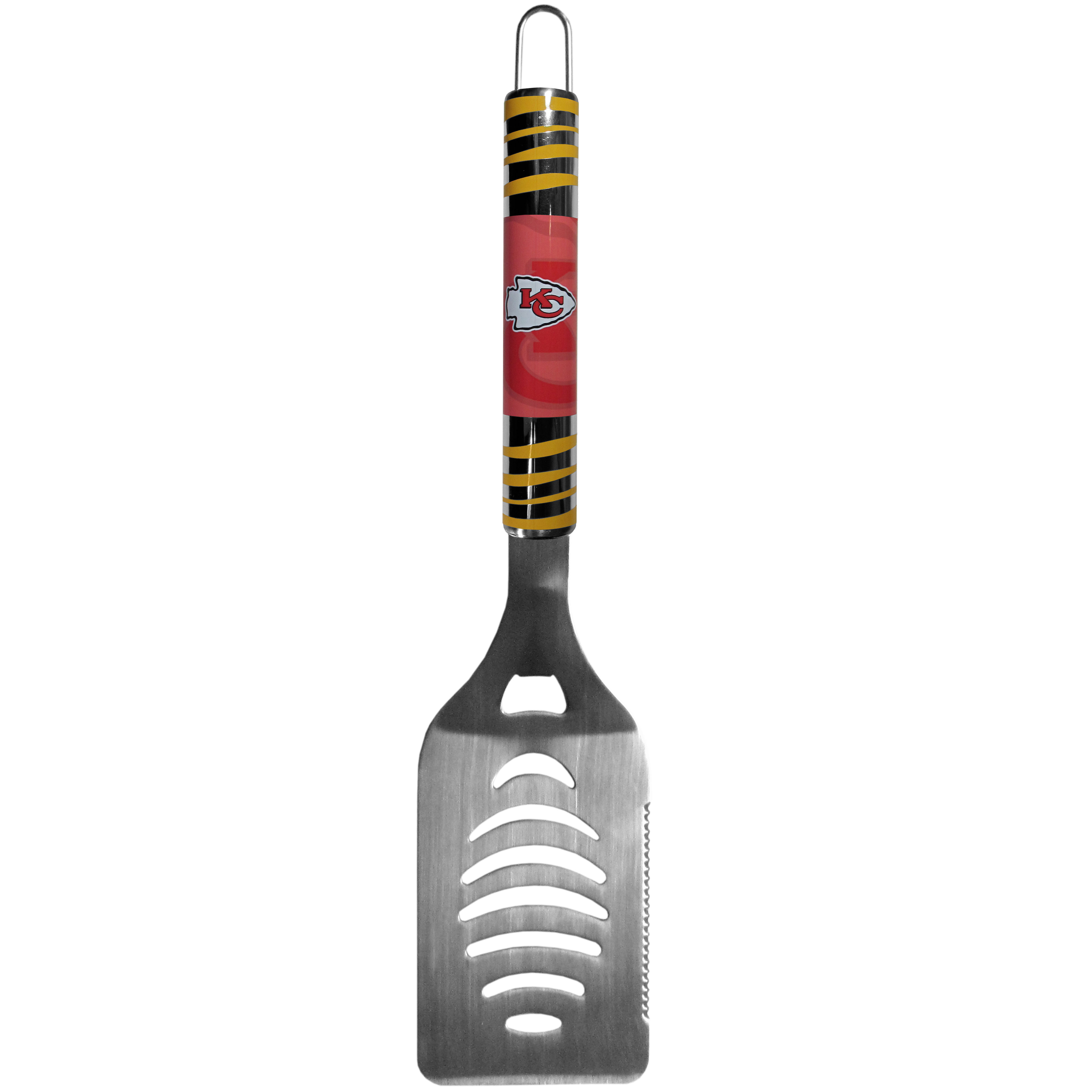 Our tailgater spatula really catches your eye with flashy chrome accents and vivid Kansas City Chiefs digital graphics. The 420 grade stainless steel spatula is a tough, heavy-duty tool that will last through years of tailgating fun. The spatula features a bottle opener and sharp serrated edge.