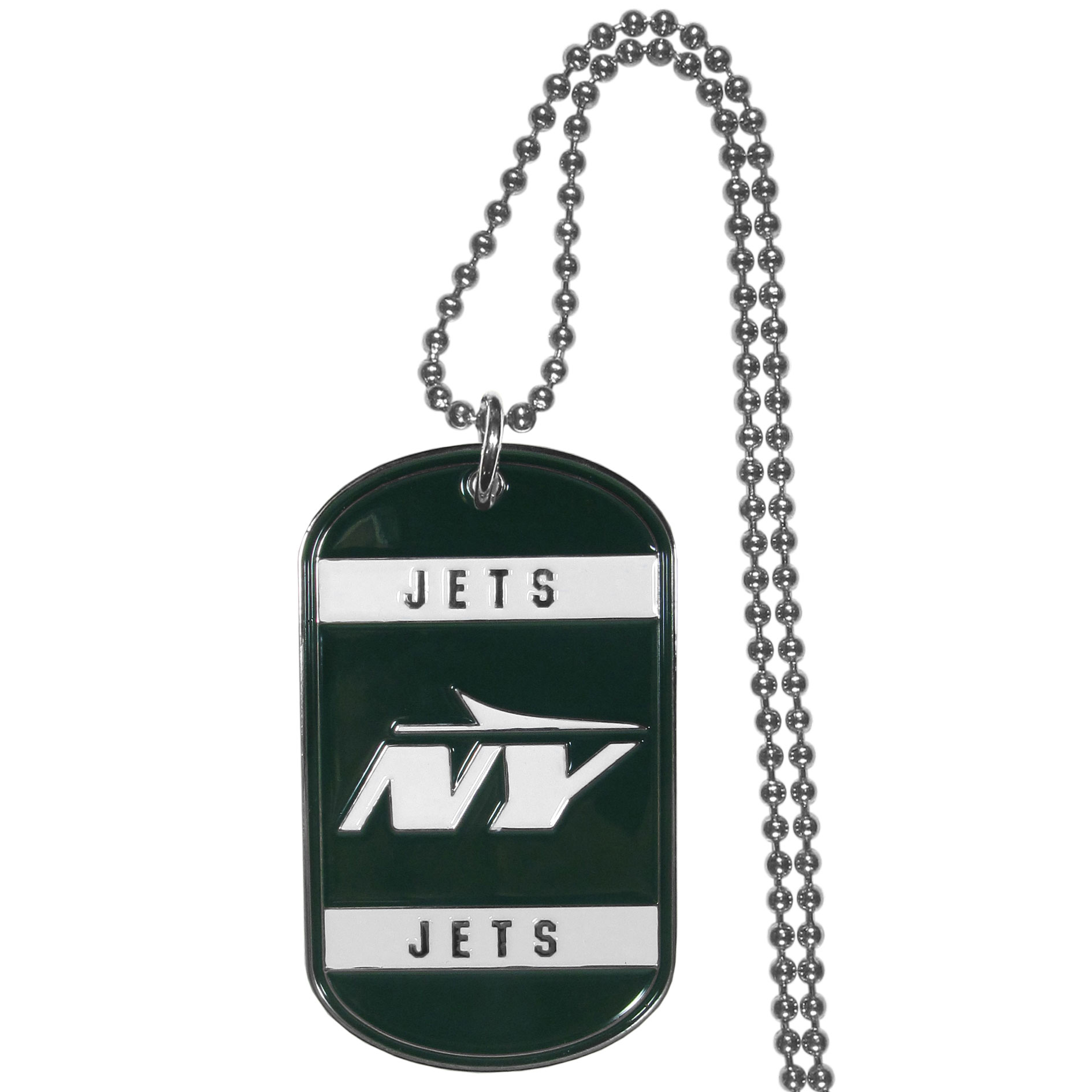 Expertly crafted New York Jets tag necklaces featuring fine detailing and a hand enameled finish with chrome accents. 26"Chain.