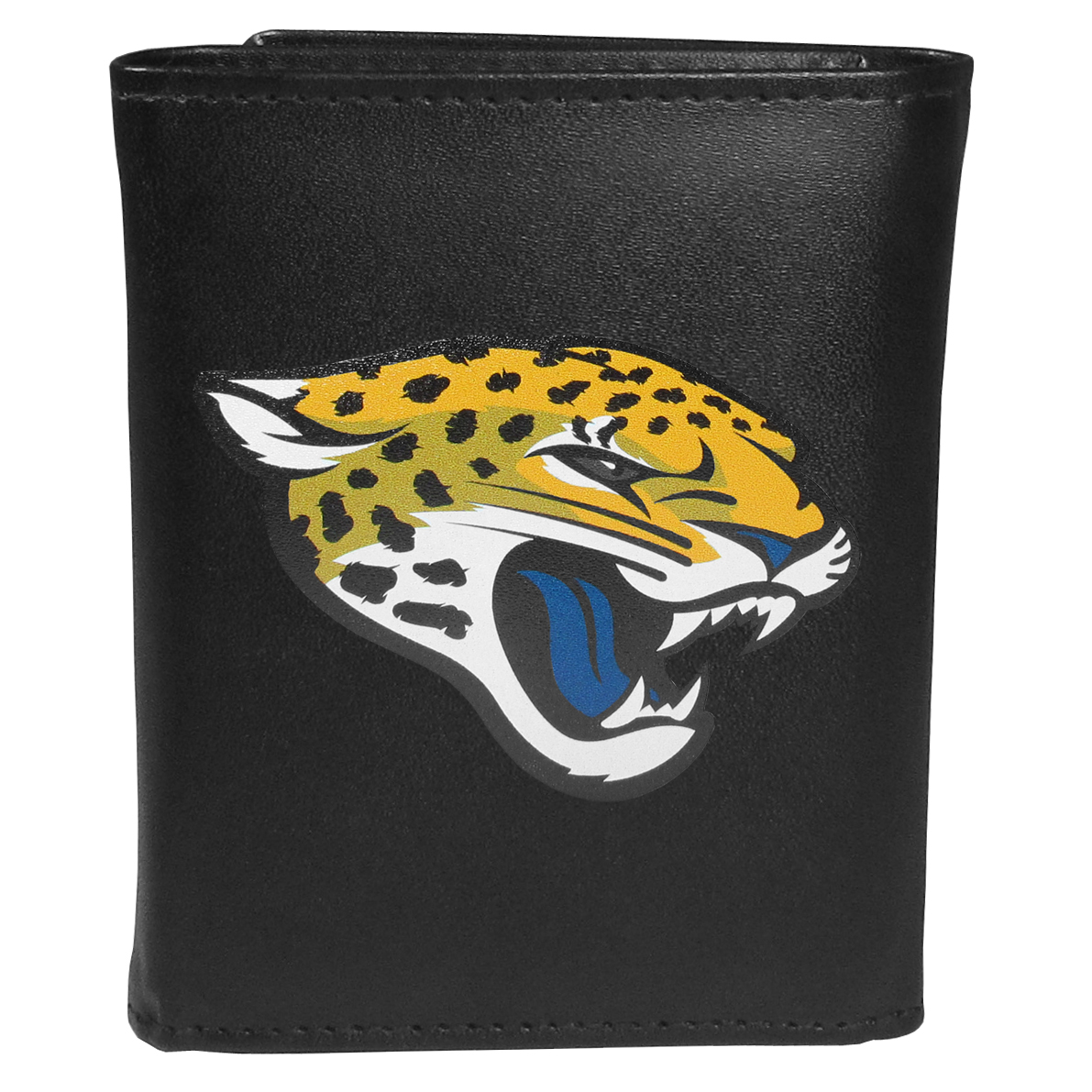 Sports fans do not have to sacrifice style with this classic tri-fold wallet that sports theJacksonville Jaguars extra large logo. This men's fashion accessory has a leather grain look and expert craftmanship for a quality wallet at a great price. The wallet features inner credit card slots, windowed ID slot and a large billfold pocket. The front of the wallet features an extra large printed team logo.