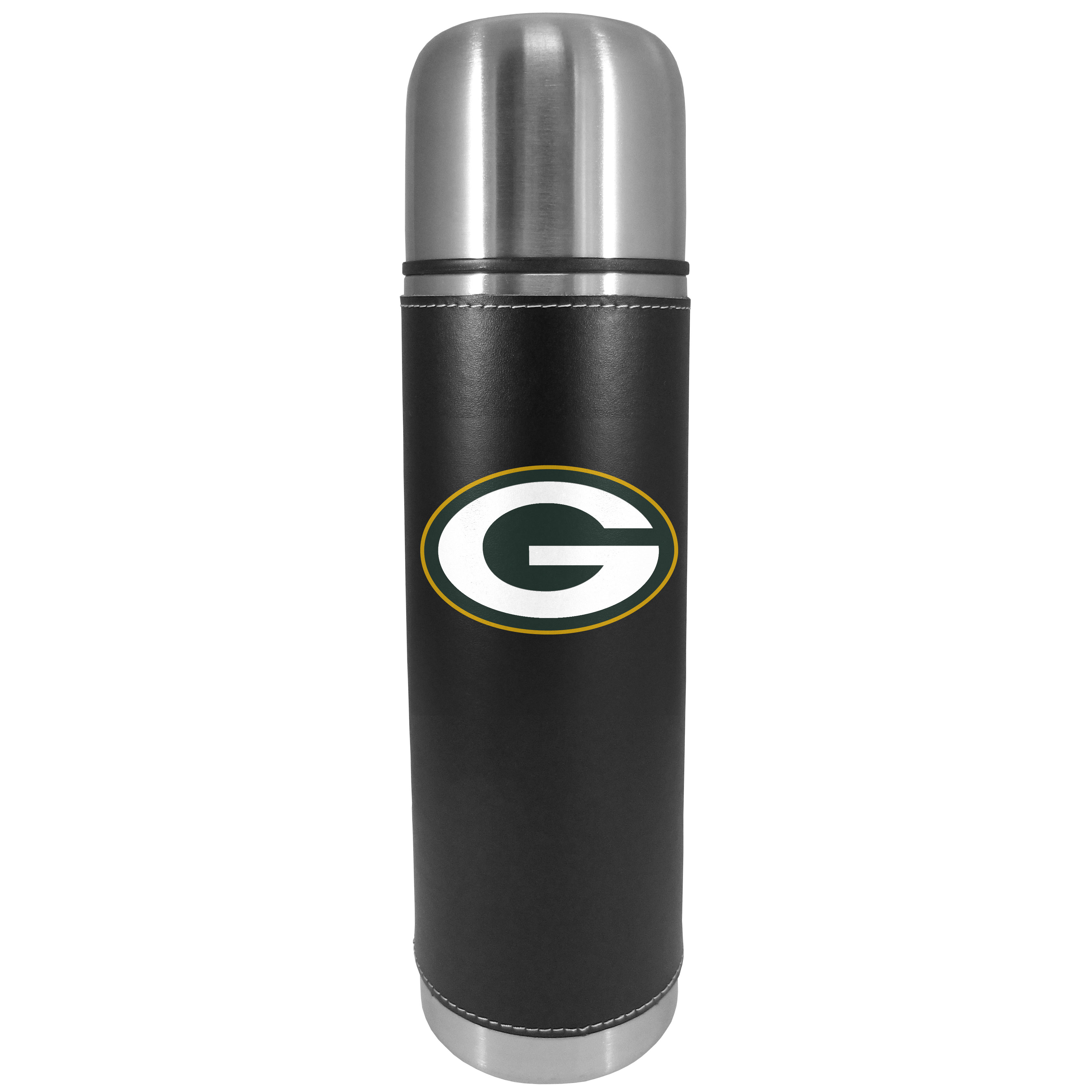 This attractive, 26 ounce Green Bay Packers thermos is a great way to keep your beverages hot while on the go. The 11 inch tall, vacuum sealed thermos features a black vinyl wrap with stitched details and a digitally printed team logo. The lid screws on and can be used as a cup.