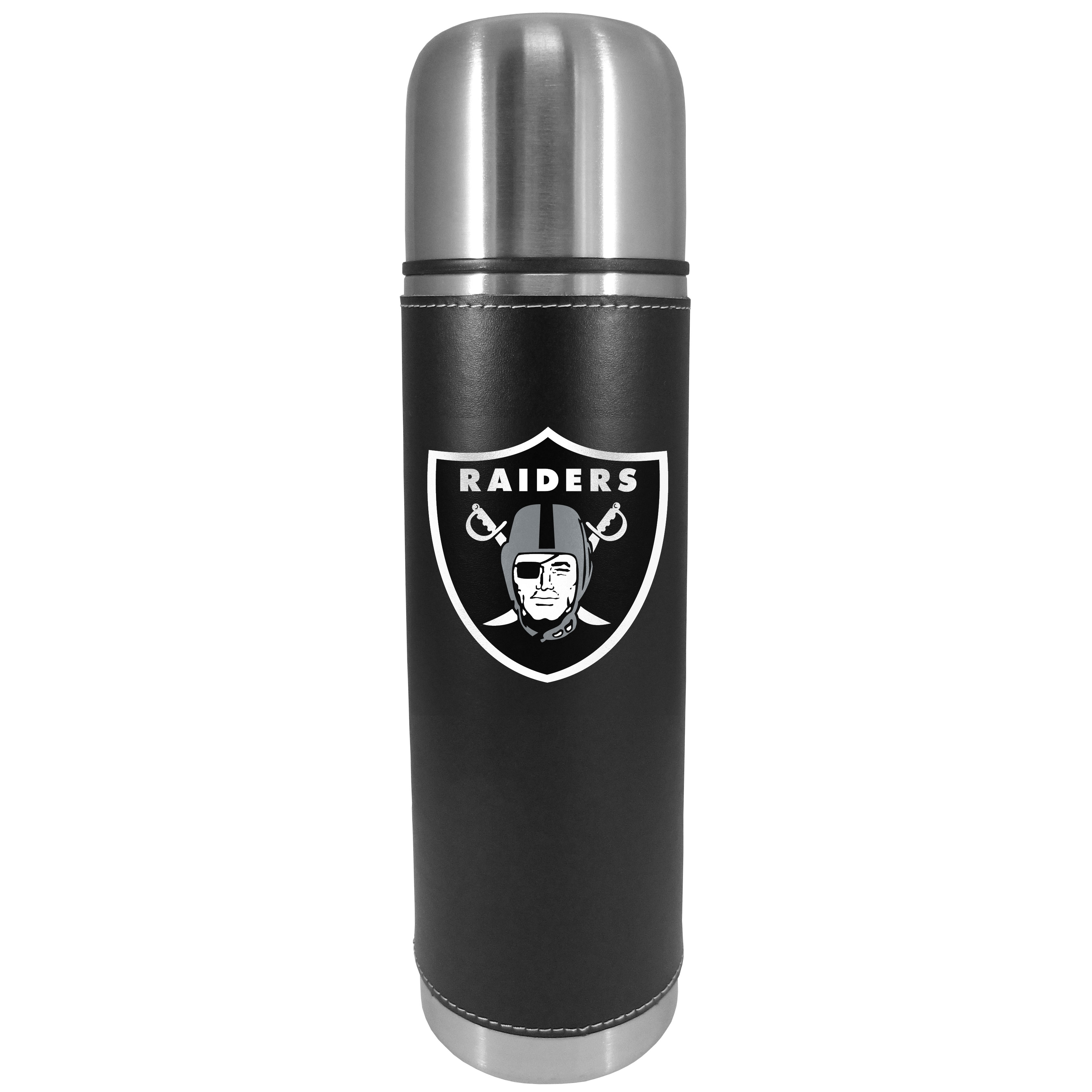This attractive, 26 ounce Las Vegas Raiders thermos is a great way to keep your beverages hot while on the go. The 11 inch tall, vacuum sealed thermos features a black vinyl wrap with stitched details and a digitally printed team logo. The lid screws on and can be used as a cup.