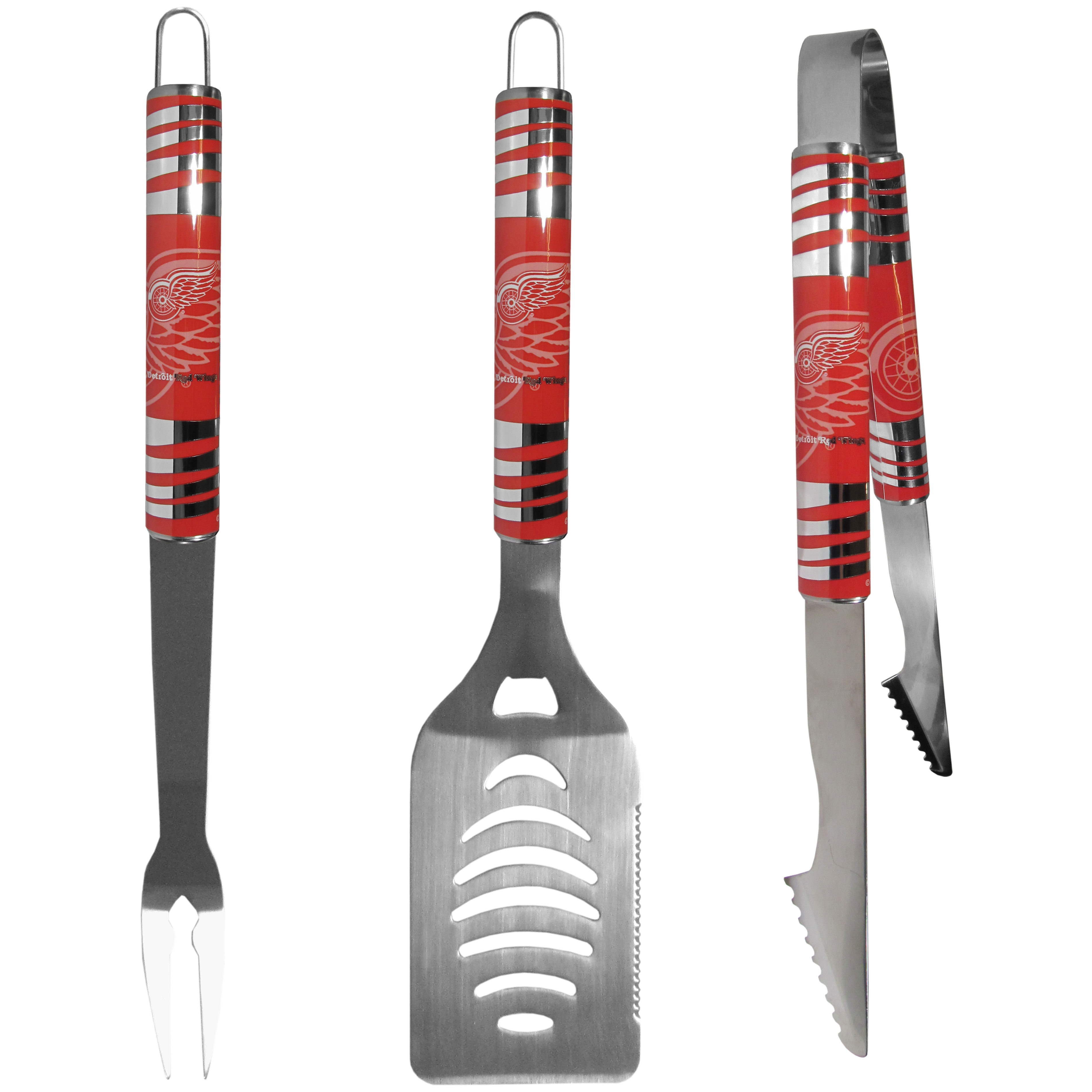 The eye-catching chrome graphics on this set make it a game day favorite! The high-quality, 420 grade stainless steel 3 pc Detroit Red Wings® BBQ grill set will make any grill master smile. These barbeque tools are made to last whether you are using them for camping, tailgating or a patio party you will have quality grill tools for years to come. The set includes a large spatula with a bottle opener feature and sharp serrated edge, strong tongs and fork. The 16 inch length keeps you far from the flames. The quality of the tools make them a great choice for Father's Day or Christmas gifts, they are really a grill accessory must have.