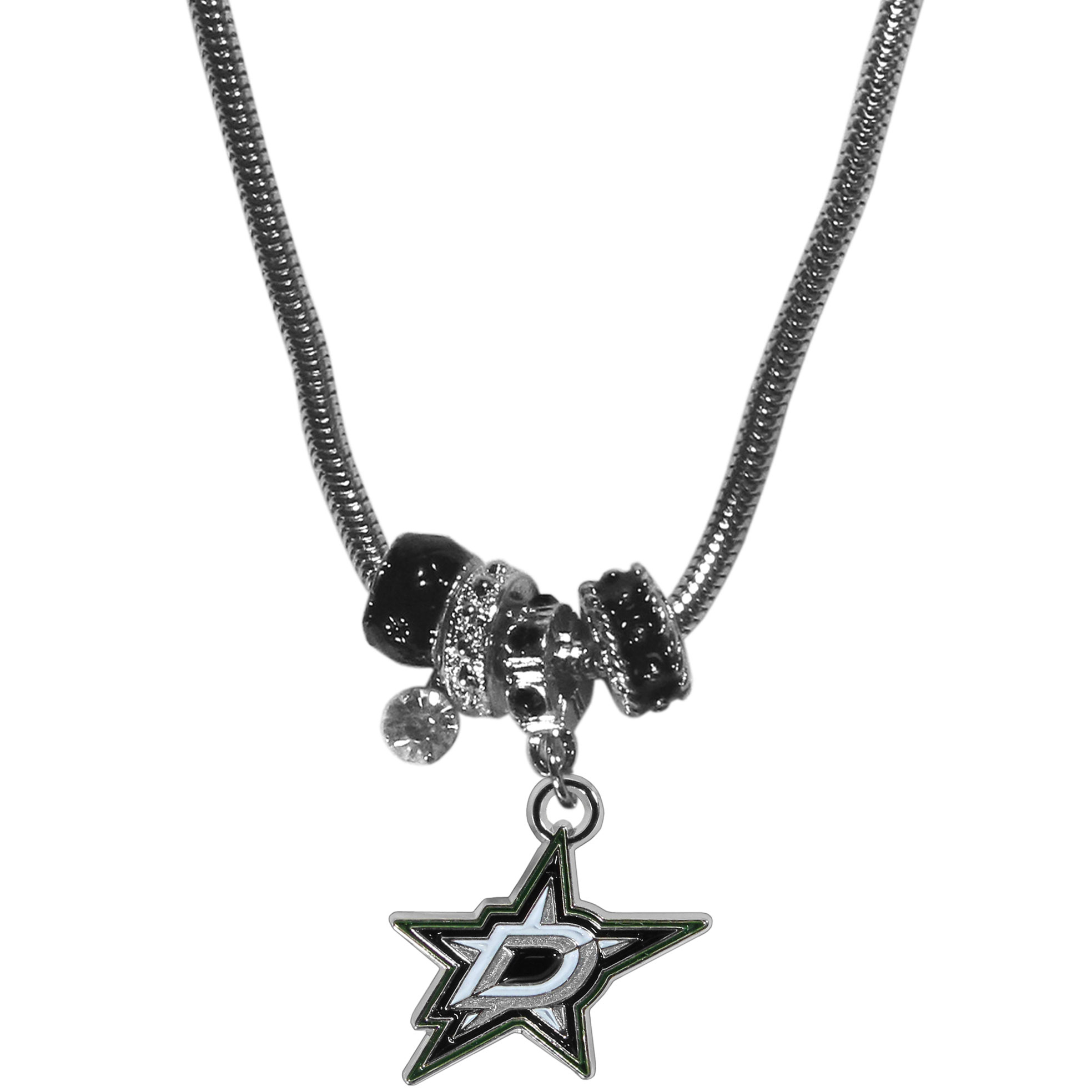 We have combined the wildly popular Euro style beads with your favorite team to create our Dallas Stars™ bead necklace. The 18 inch snake chain features 4 Euro beads with enameled team colors and rhinestone accents with a high polish, nickel free charm and rhinestone charm. Perfect way to show off your team pride.