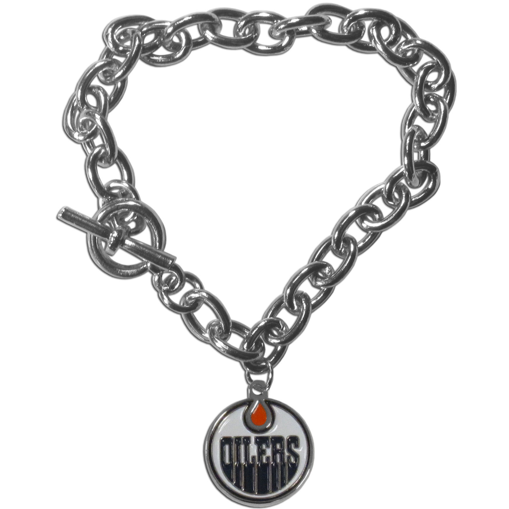 Our classic single charm bracelet is a great way to show off your team pride! The 7.5 inch large link chain features a high polish Edmonton Oilers® charm and features a toggle clasp which makes it super easy to take on and off.