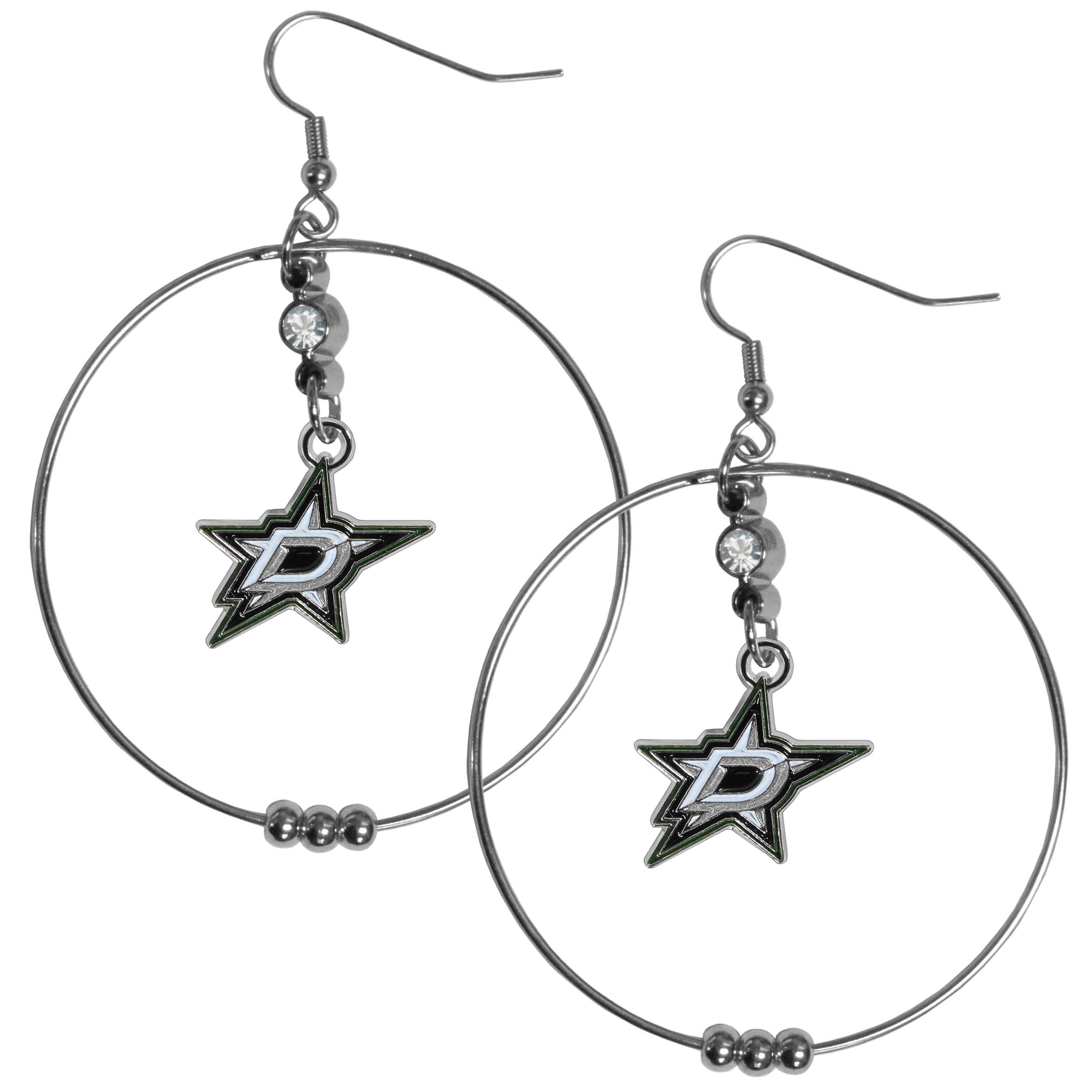 These trend-setting Dallas Stars™ 2 inch Hoop earrings are casual and lightweight large hoops with eye catching team charm and crystal accent. These trendy earrings feature a 2 inch hoop with a floating rhinestone and team charm with carved and enameled details. Sporty meets chic with these sassy earrings that would make the perfect gift for any female fan. The perfect game-day accessory and also fun for any day.