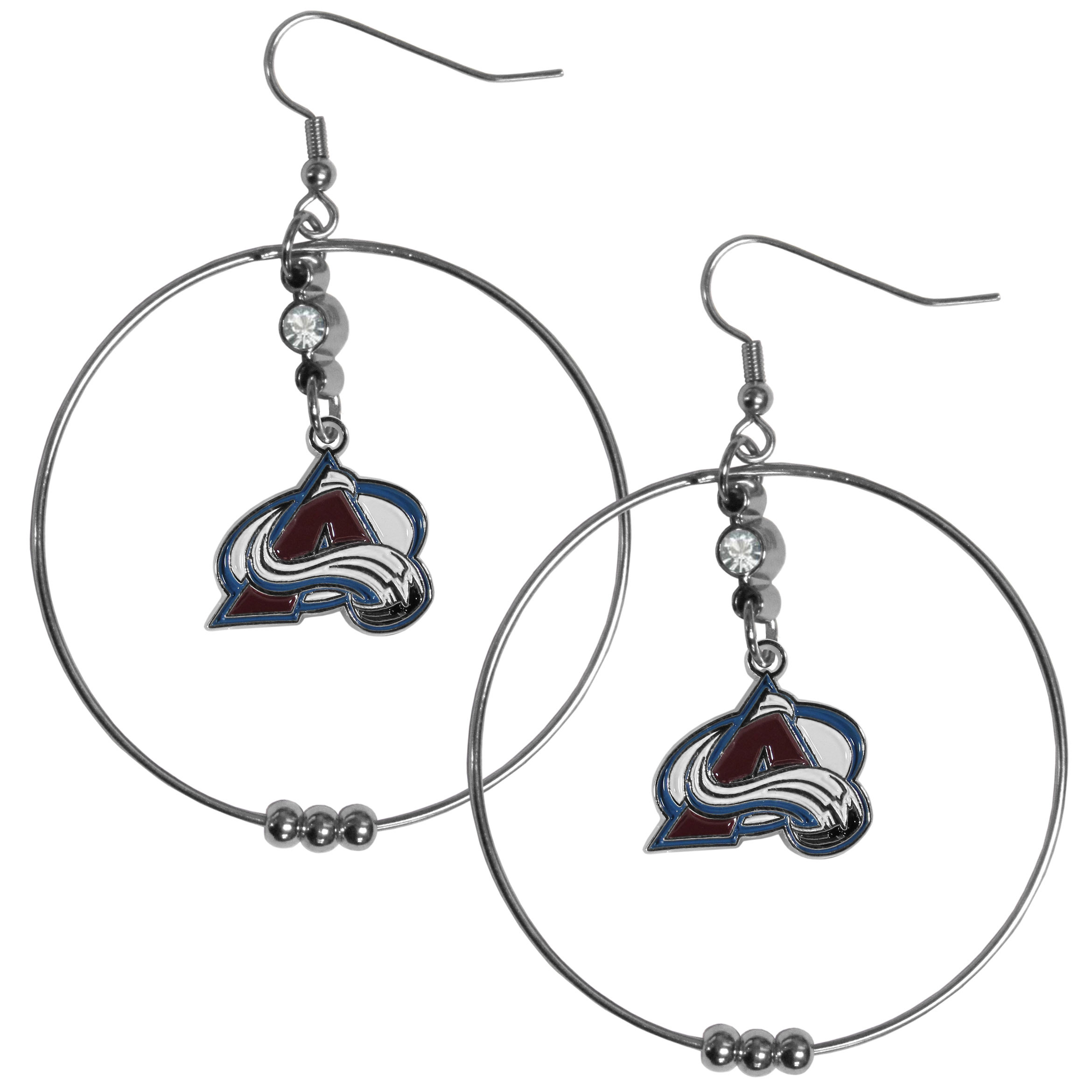 These trend-setting Colorado Avalanche® 2 inch Hoop earrings are casual and lightweight large hoops with eye catching team charm and crystal accent. These trendy earrings feature a 2 inch hoop with a floating rhinestone and team charm with carved and enameled details. Sporty meets chic with these sassy earrings that would make the perfect gift for any female fan. The perfect game-day accessory and also fun for any day.