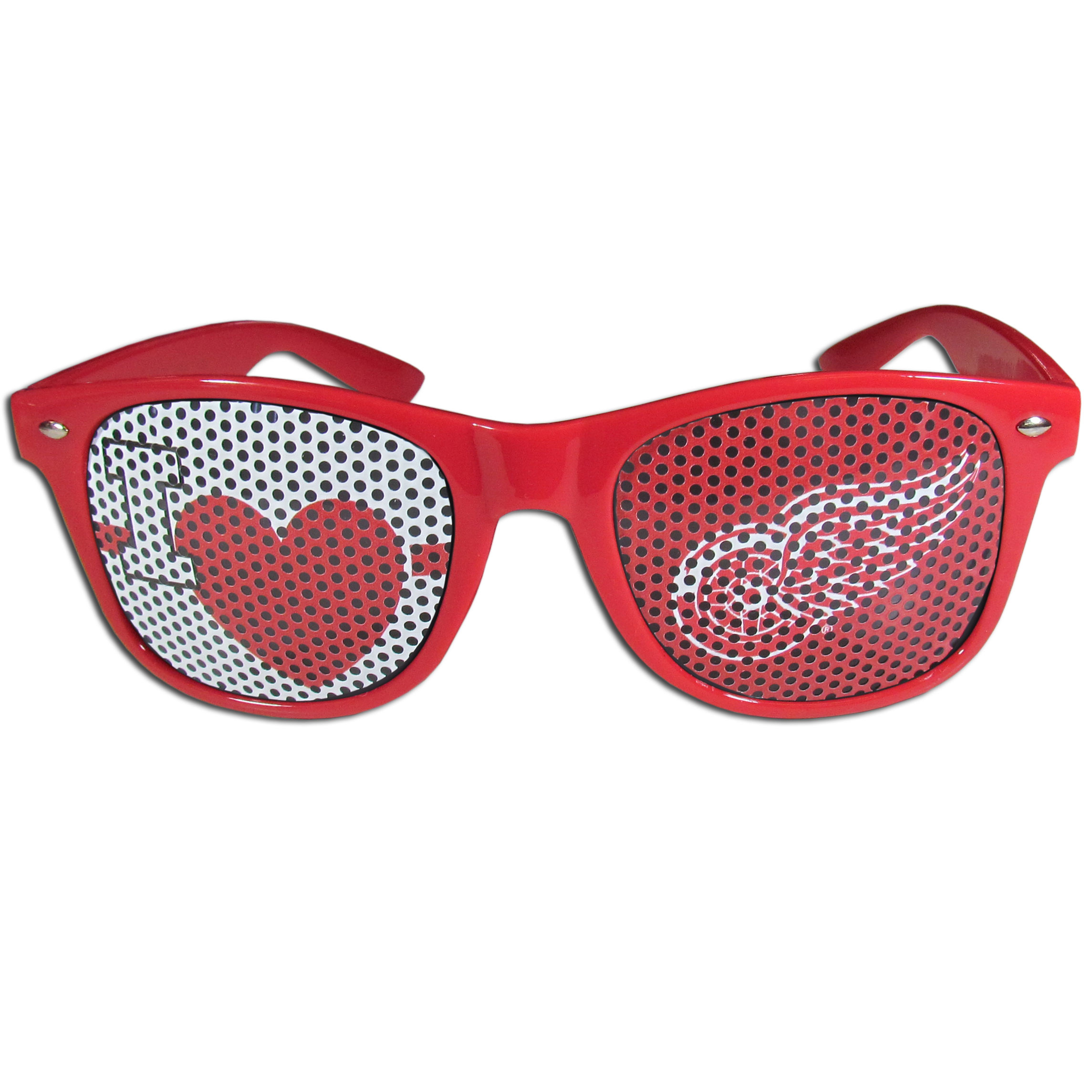 Our officially licensed I Heart game day shades are the perfect accessory for the devoted Detroit Red Wings® fan! The sunglasses have durable polycarbonate frames with flex hinges for comfort and damage resistance. The lenses feature brightly colored team clings that are perforated for visibility.
