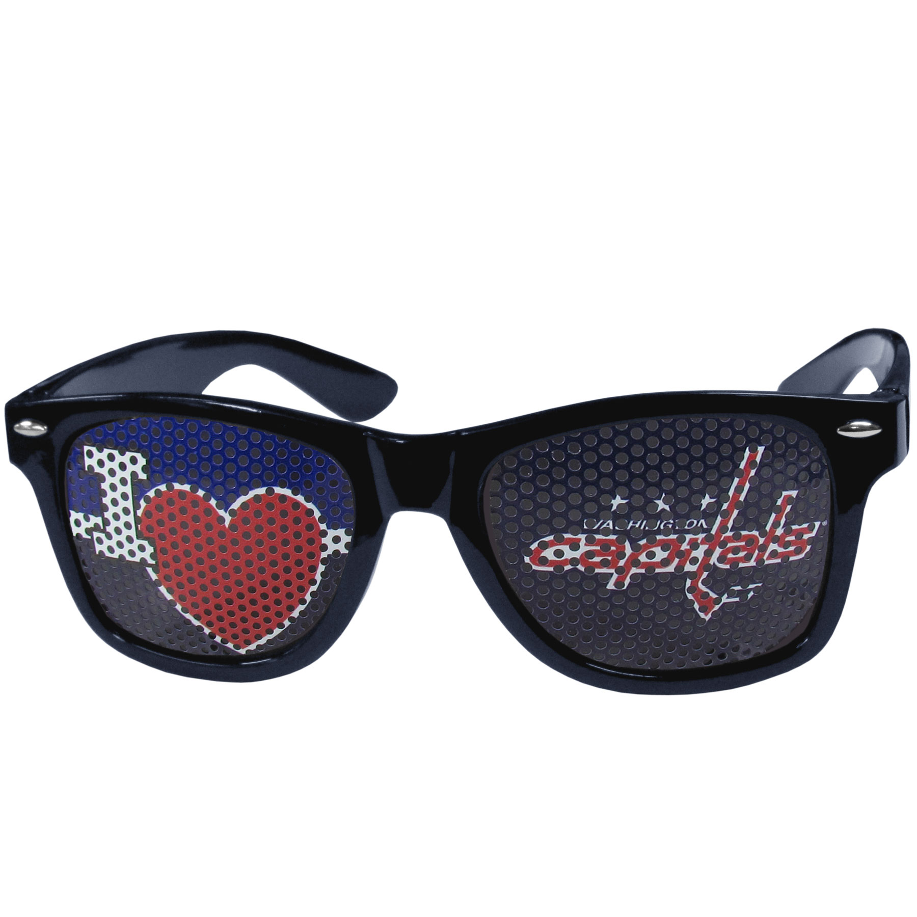 Our officially licensed I Heart game day shades are the perfect accessory for the devoted Washington Capitals® fan! The sunglasses have durable polycarbonate frames with flex hinges for comfort and damage resistance. The lenses feature brightly colored team clings that are perforated for visibility.