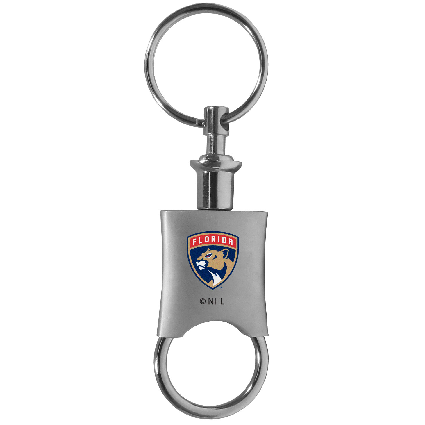 This high-quality key chain is both fashionable and functional. The key chain features to key rings and one of them detaches easily for valet use so you do not have to risk giving out all of your keys. The beautiful brushed metal finish features the Florida Panthers® logo expertly printed on front.